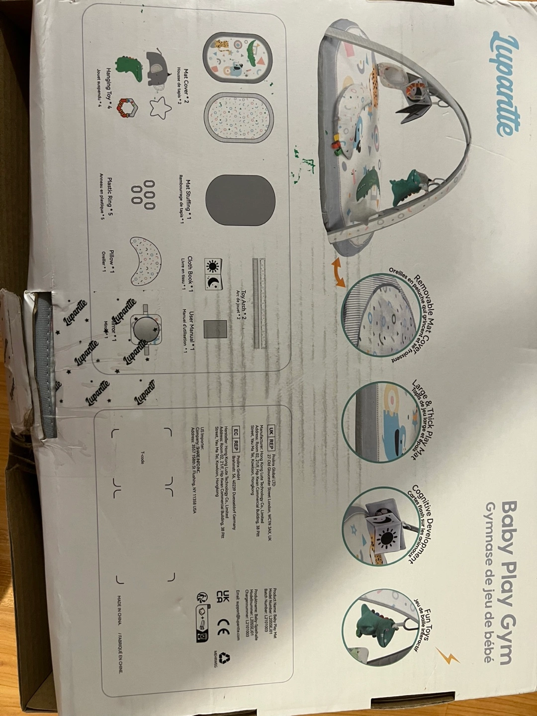 Selling a Lupantte Baby Play Gym in excellent condition! It's a fun and engaging play area for your little one. Features a large and thick play mat for comfort and cognitive development. Comes with fun toys to encourage motor skills! Includes a head pillow, hanging toys, and a soft mat cover