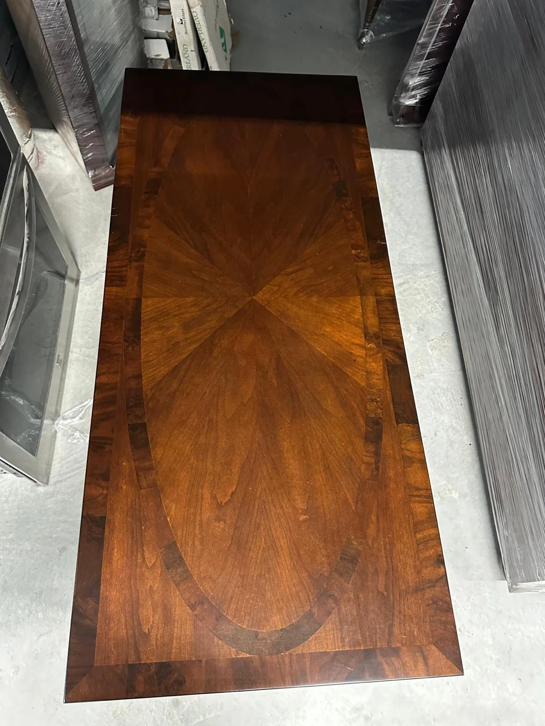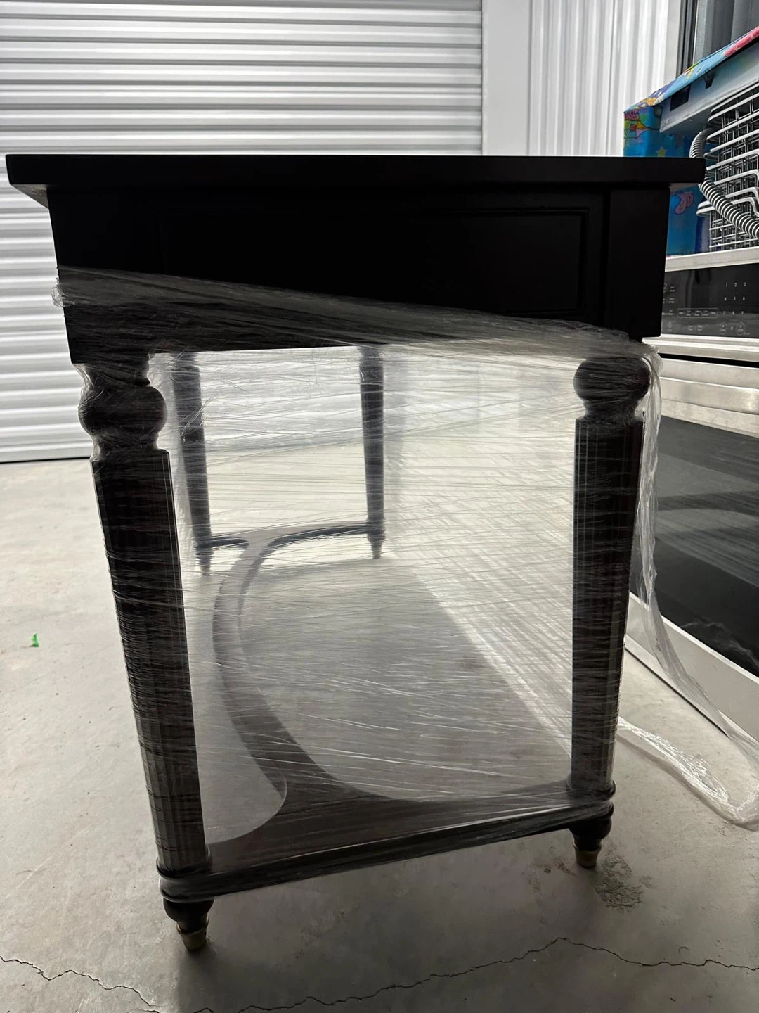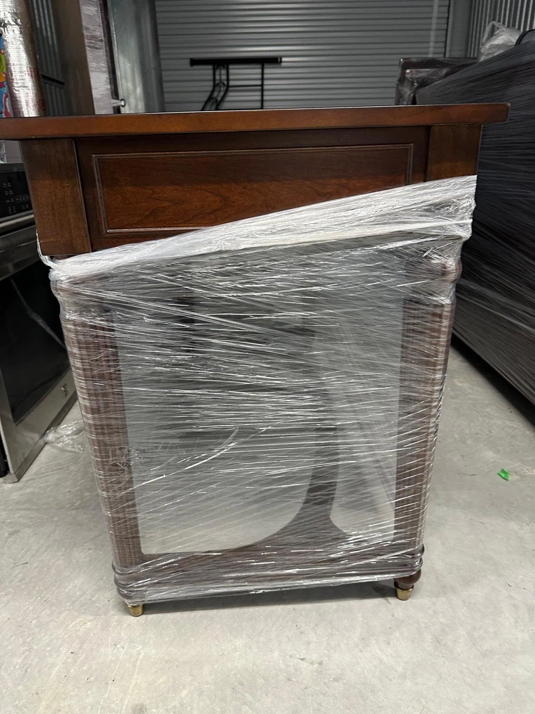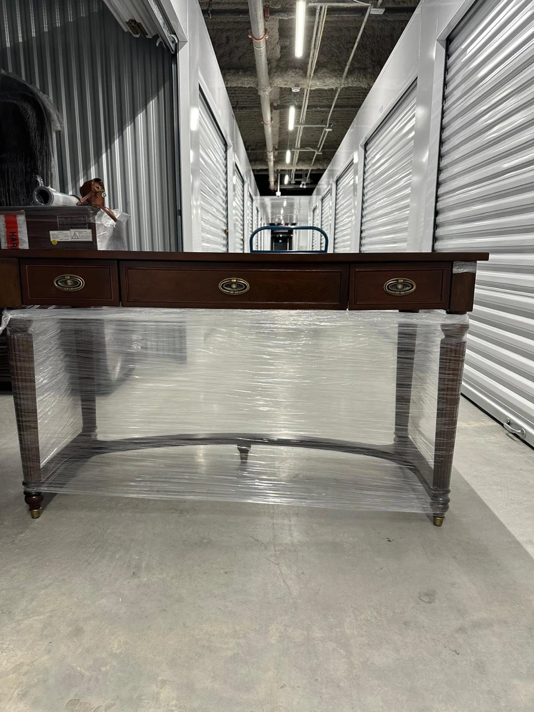 Selling a lovely wooden desk, perfect for a home office or study space! It features drawers for storage and a classic design. It's wrapped in plastic for protection during transport or storage