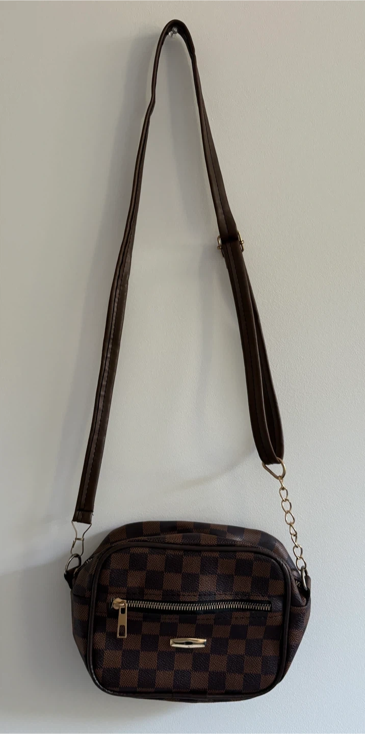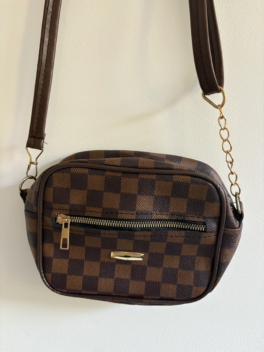 Cute brown checkered shoulder bag with a gold chain detail It has a zipper closure and a long shoulder strap.