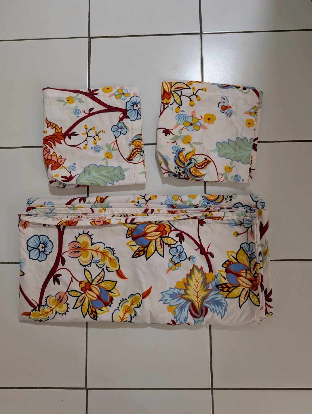 Selling a lovely floral patterned bedding set. It includes pillowcases and a bedsheet. The colours are vibrant and would brighten up any bedroom!2 pillow covers
