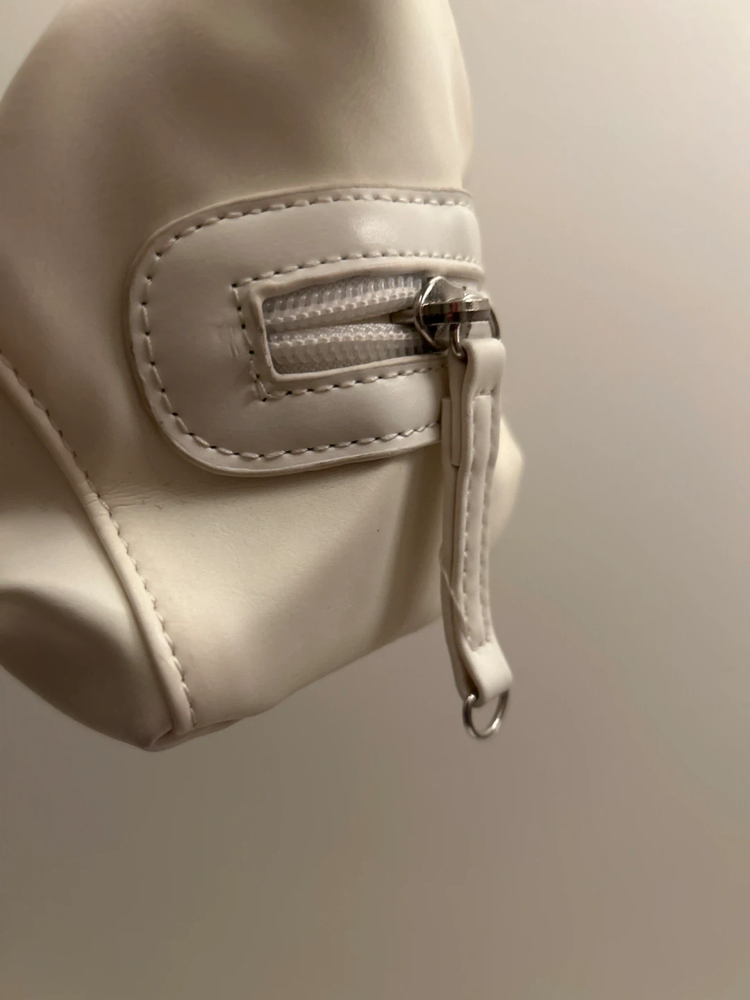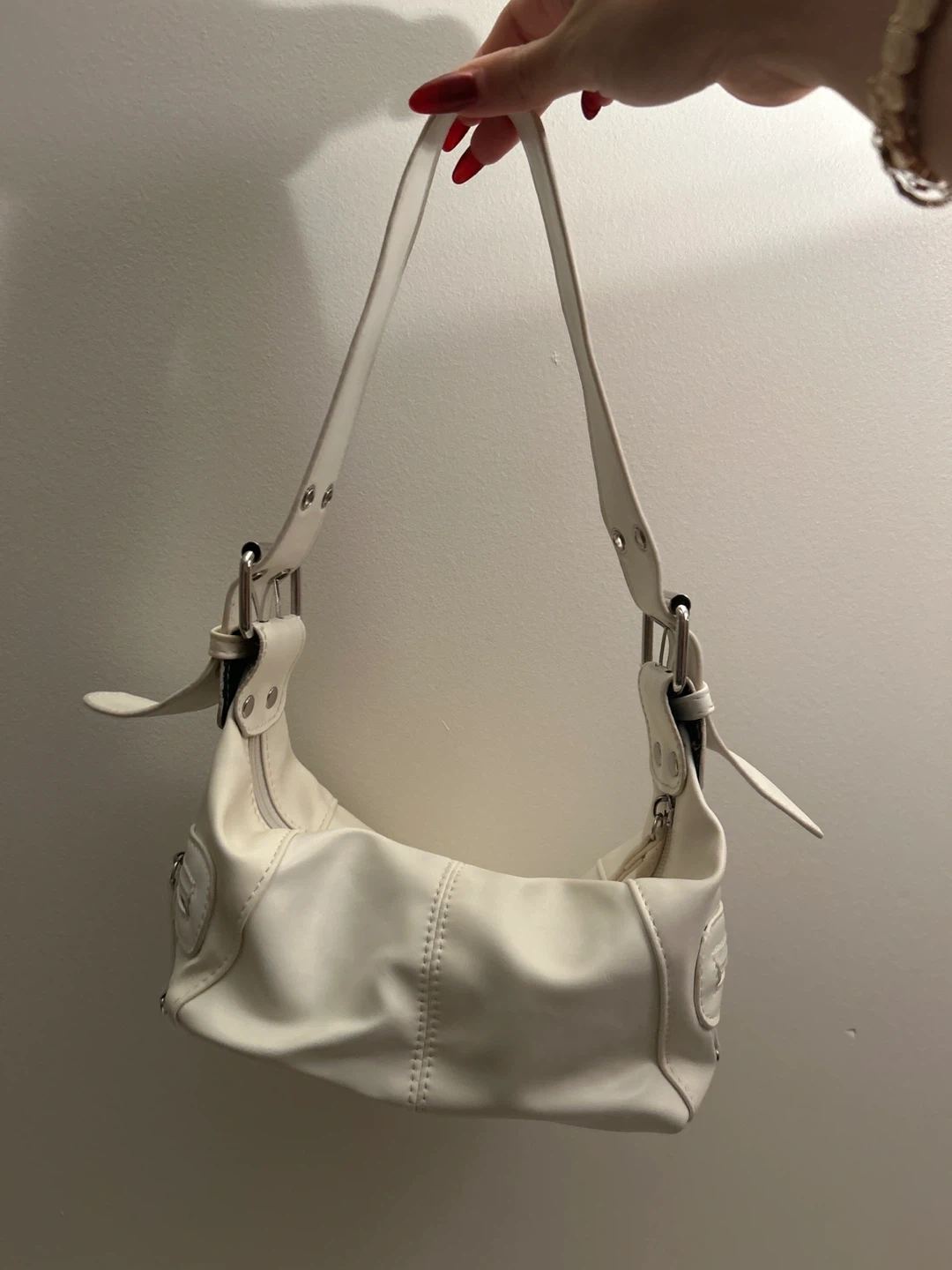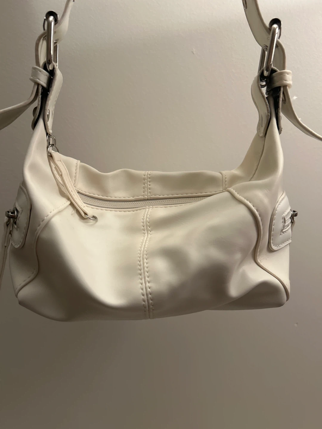 77Selling a cute white shoulder bag! It's in good condition and perfect for everyday use. The material is a soft, flexible leather. The bag features a zipper closure and silver hardware. It's a stylish and practical accessory!