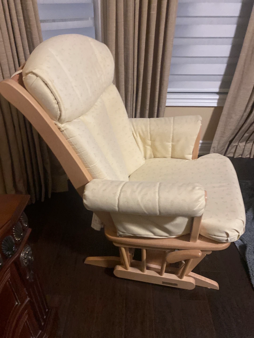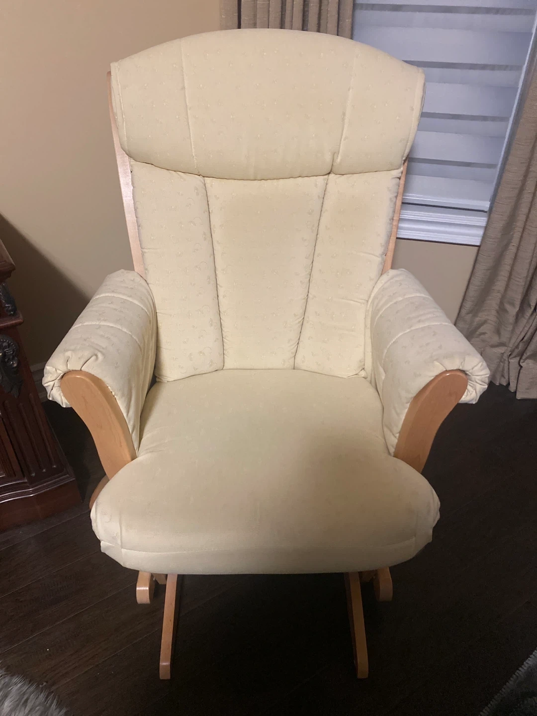 Selling a comfy cream-coloured glider rocking chair! It's in great condition and perfect for relaxing or nursing a baby. The chair has a smooth gliding motion and padded cushions for extra comfort. It would be a great addition to any nursery or living room