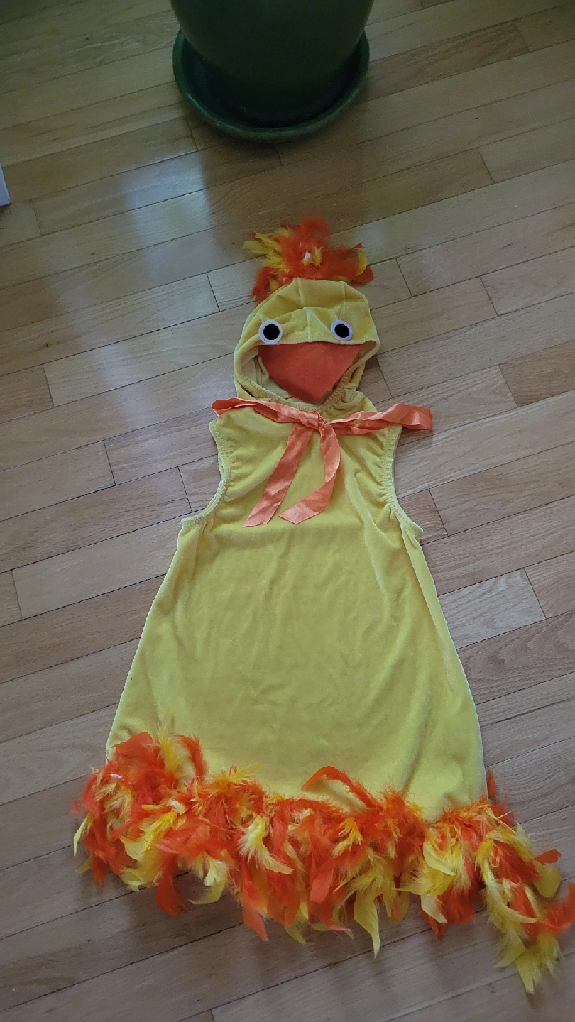 This is a super cute yellow duck costume! It's perfect for dress-up or Halloween. The costume features a hood with a duck bill and eyes, and a ribbon tie. The bottom is decorated with orange and yellow feathers. It's in great condition and ready for a new home!