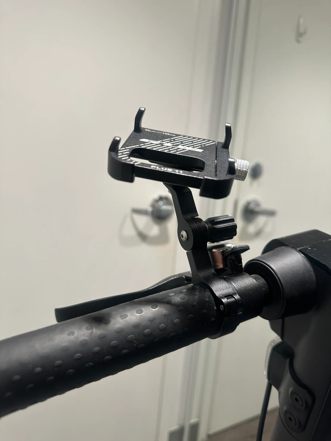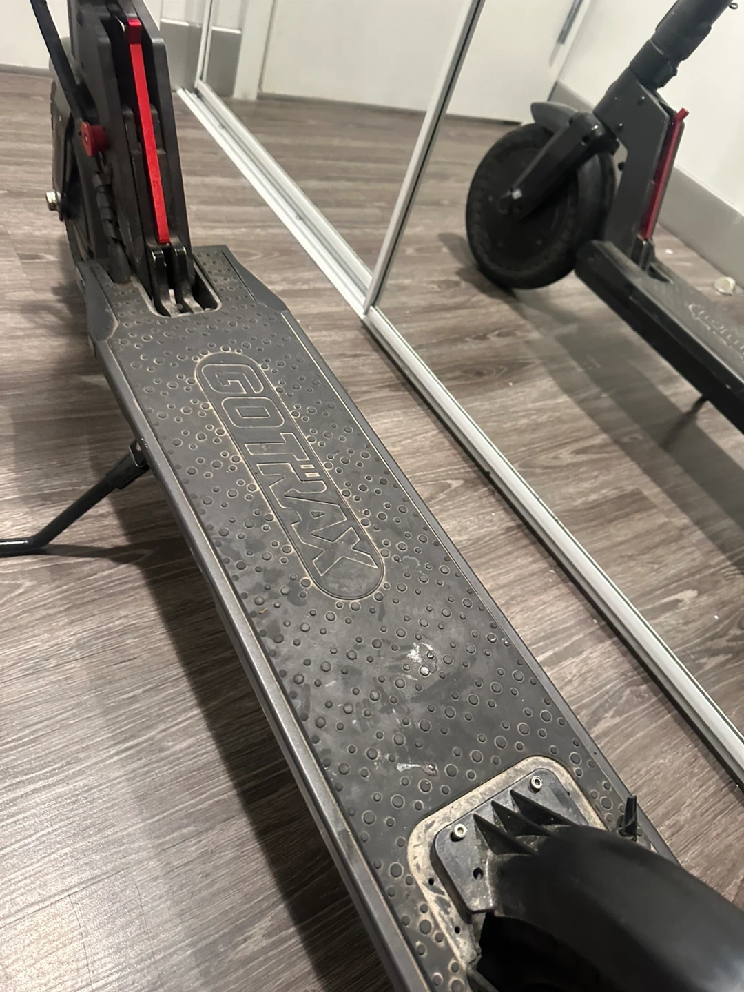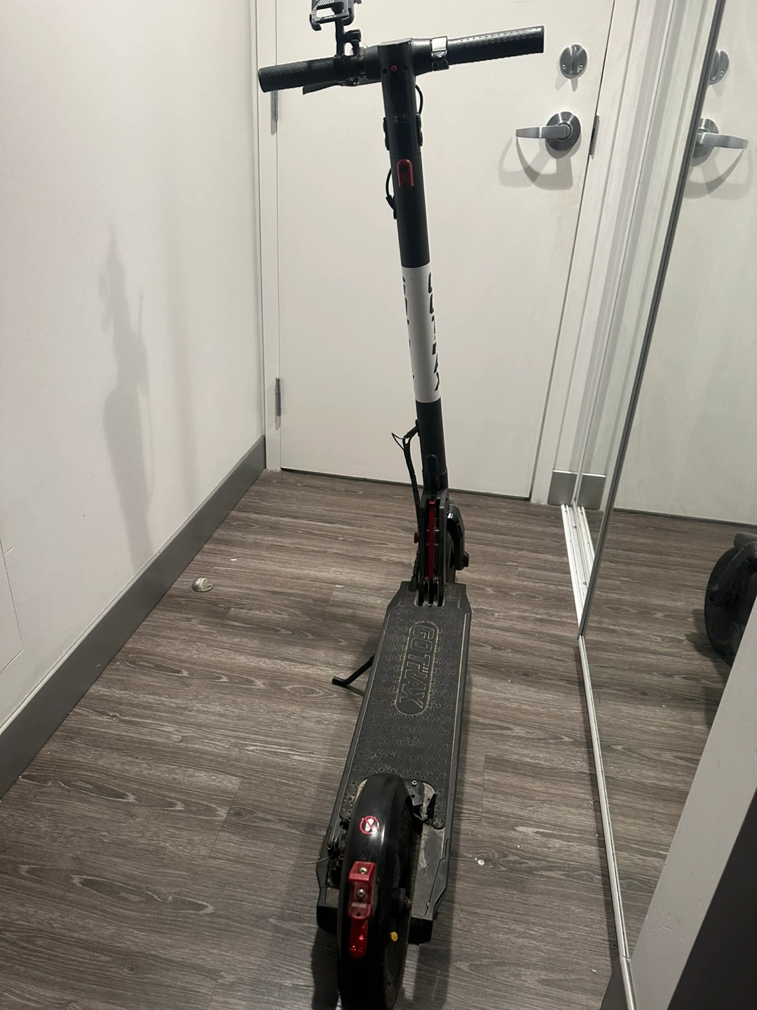 Selling a Gotrax electric scooter in used condition. It has a phone holder attached to the handle bars. There are some signs of wear and tear, as seen in the photos, but it still works great!, breaks were just repaired, and a brand new phone stand is added.