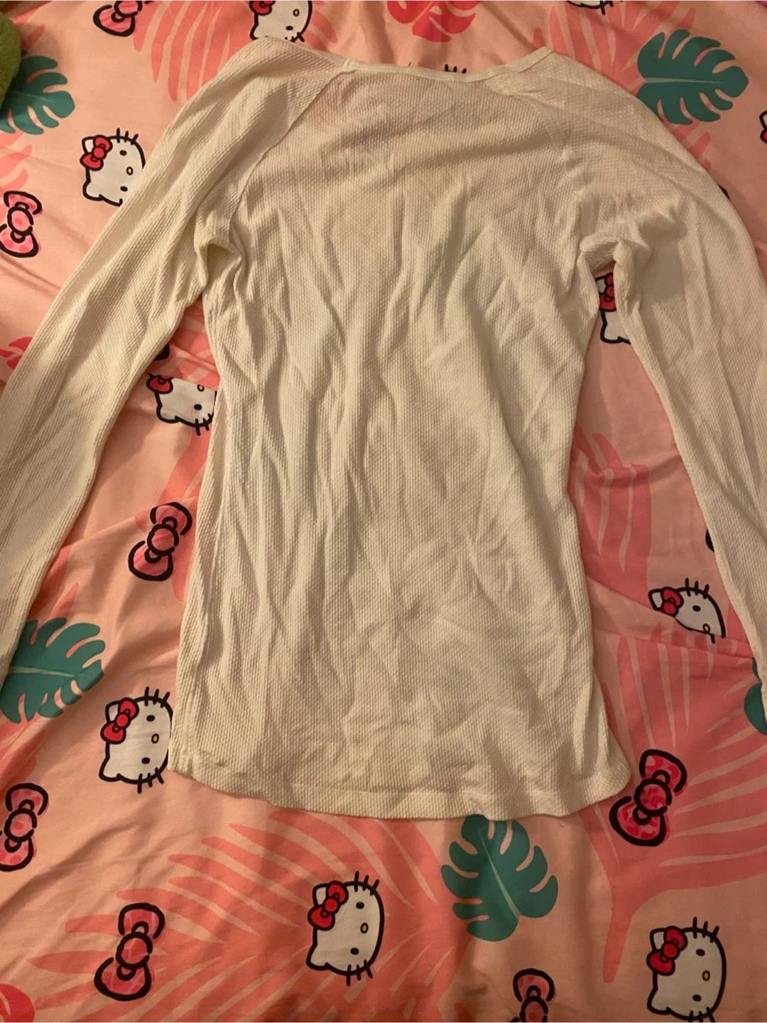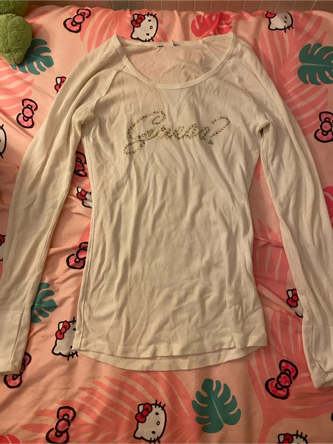 Selling a cute white long sleeve top from Guess. It has the Guess logo in gold embellishments. does not say size but fits medium/small
