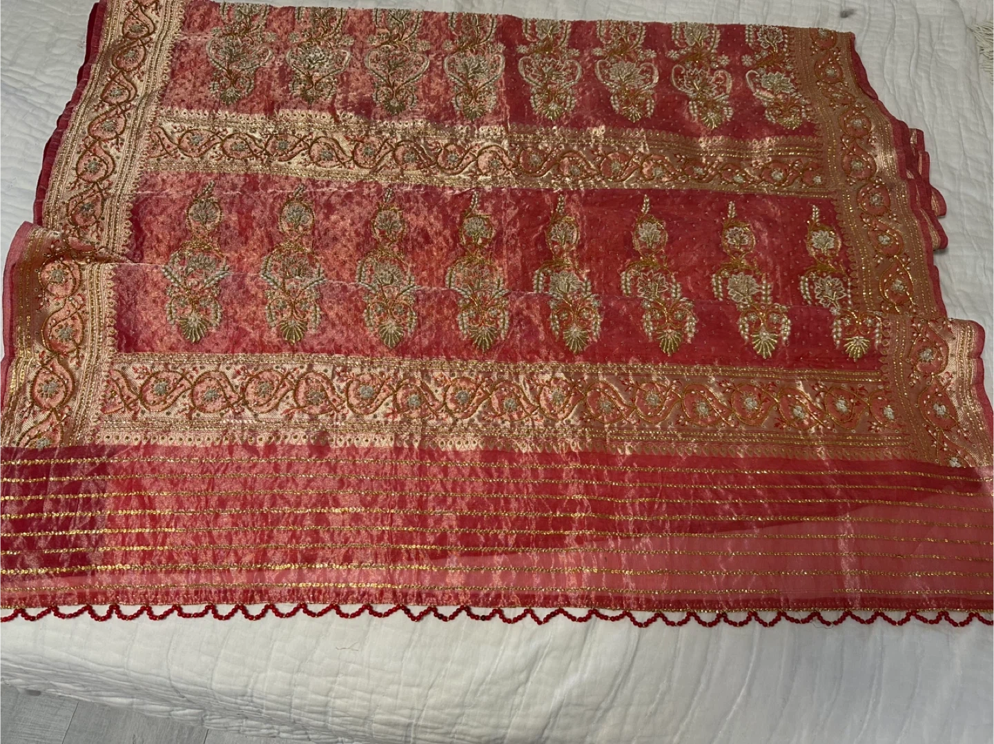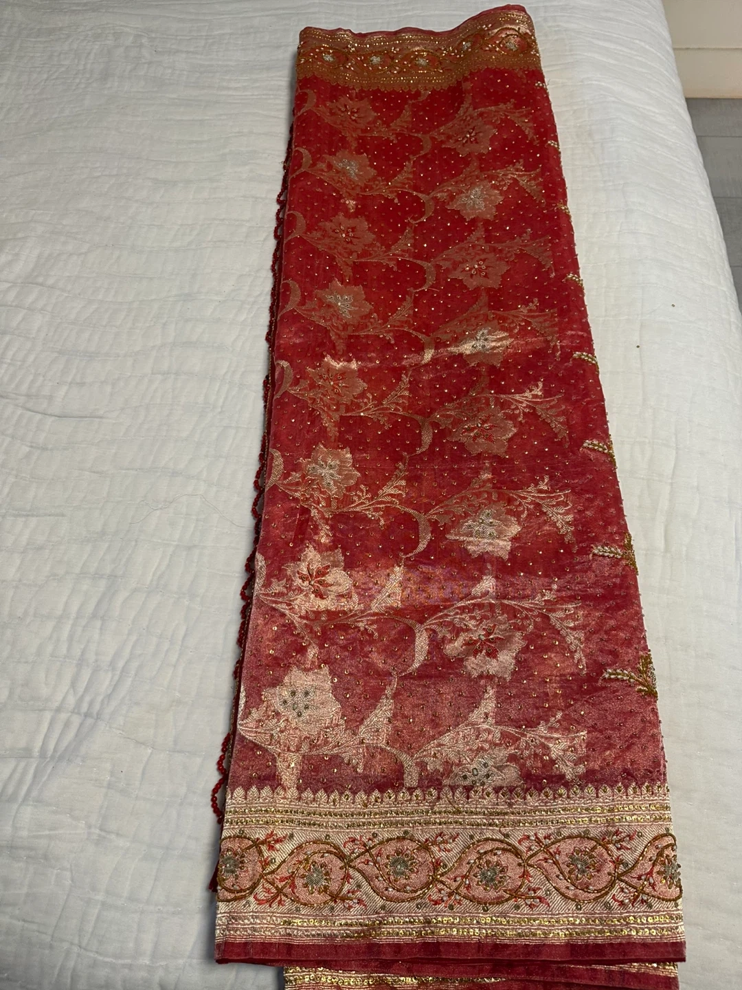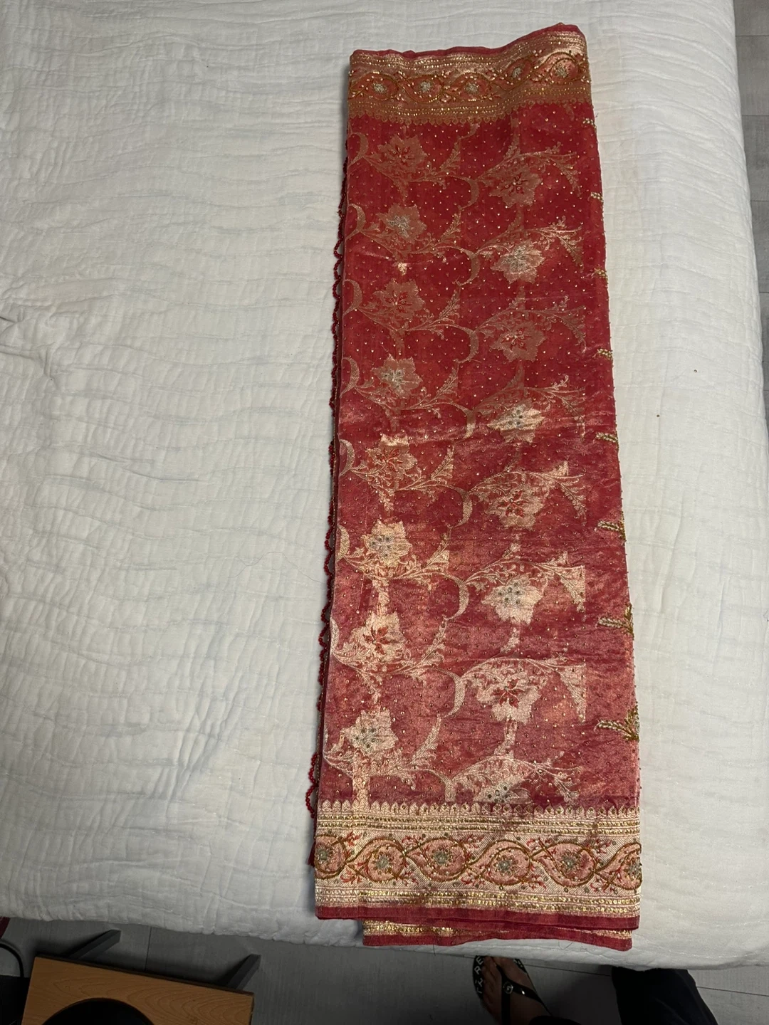 Beautiful red sari with gold embroidery. Perfect for a special occasion or cultural event. The fabric has a lovely texture and the embroidery is very detailed. It's in great condition and ready for a new home