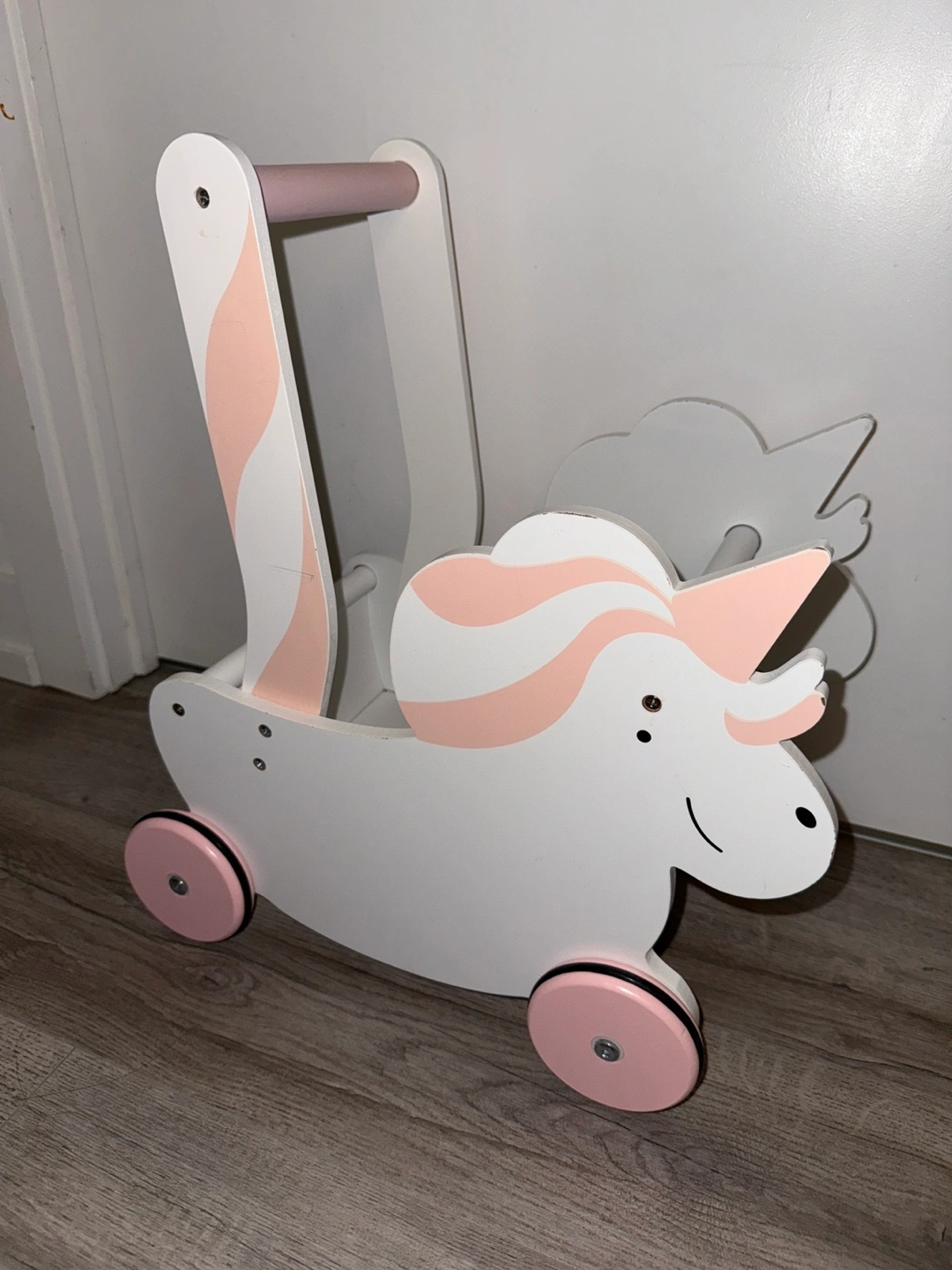 This adorable Moover unicorn baby walker is perfect for your little one! The walker is white with pink accents and features a cute unicorn design. Few paint chips.