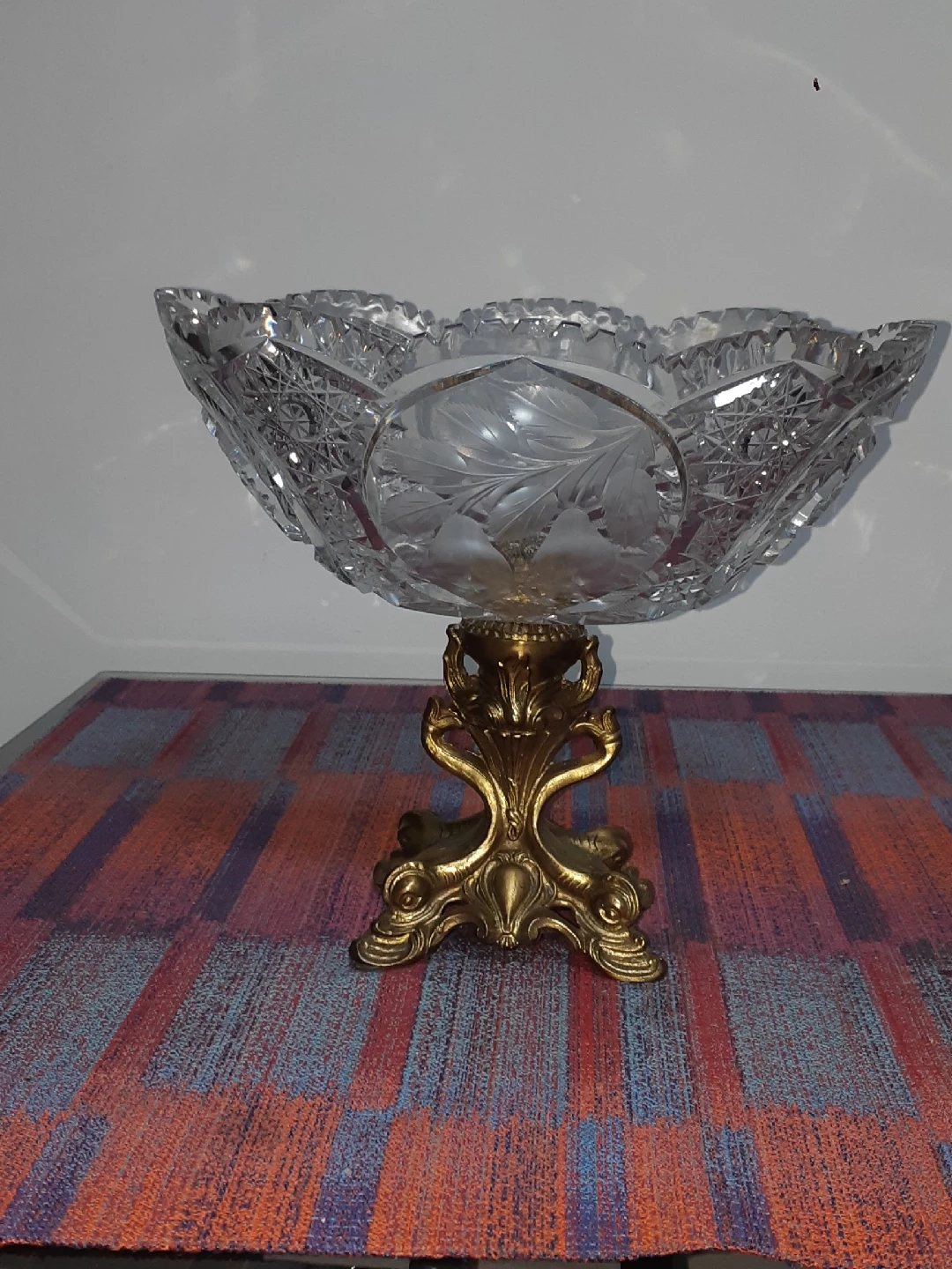 10WATERFORD Beautiful vintage crystal bowl with a lovely gold-coloured stand. It would make a great centrepiece for your dining table or a decorative accent in your living room. The crystal has intricate detailing and catches the light beautifully! wat