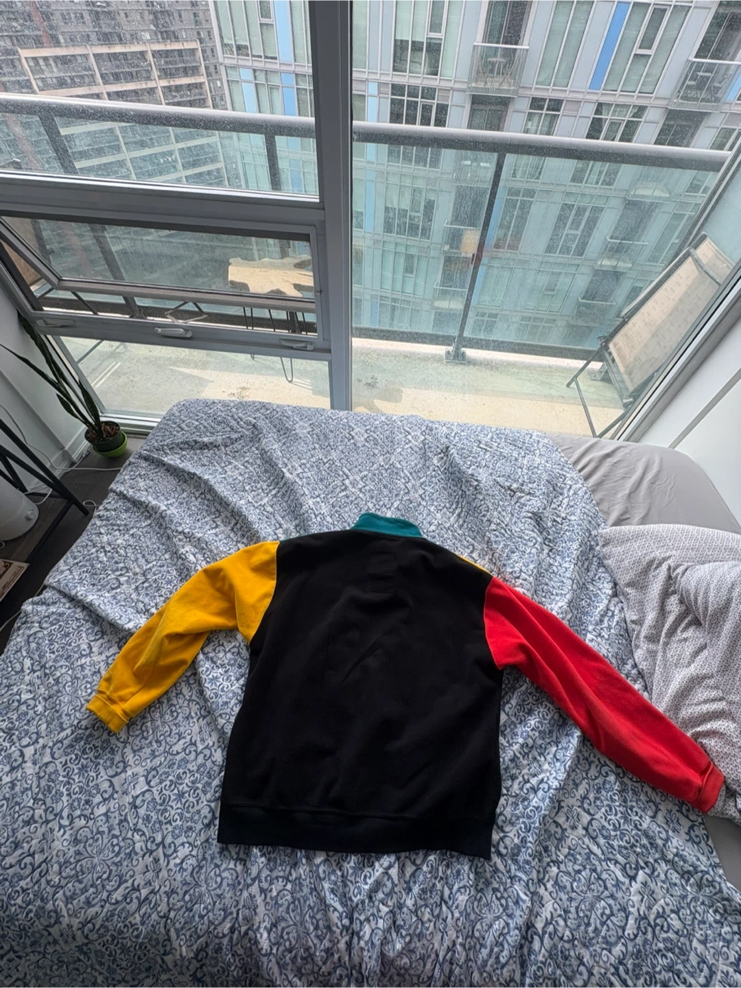Selling a Nike colour block pullover. It features a black body with red, yellow, and green colour blocking on the sleeves and collar. The front has a 'JUST DO IT' design with a Nike logo. It's a size small and in great condition!