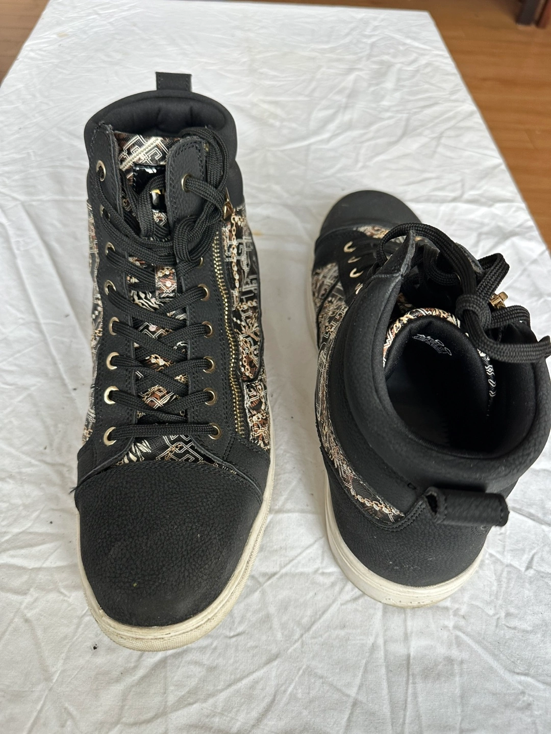 Selling a pair of black high top sneakers. They have a unique pattern on the sides and a zipper detail. They're in good condition and ready for a new home!