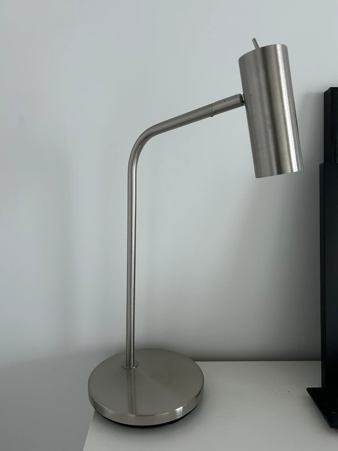 Twin stainless steel lamps in almost new condition. No chips or blemishes. It's perfect for a home office or bedside table. It has a sleek, modern design that will complement any decor.