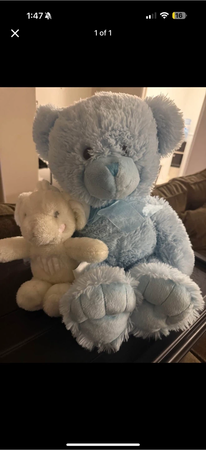 28Selling a cuddly blue teddy bear along with a small, soft plush toy! Both are in great shape and ready for a new home. Perfect for kids or anyone who loves a soft snuggle buddy
