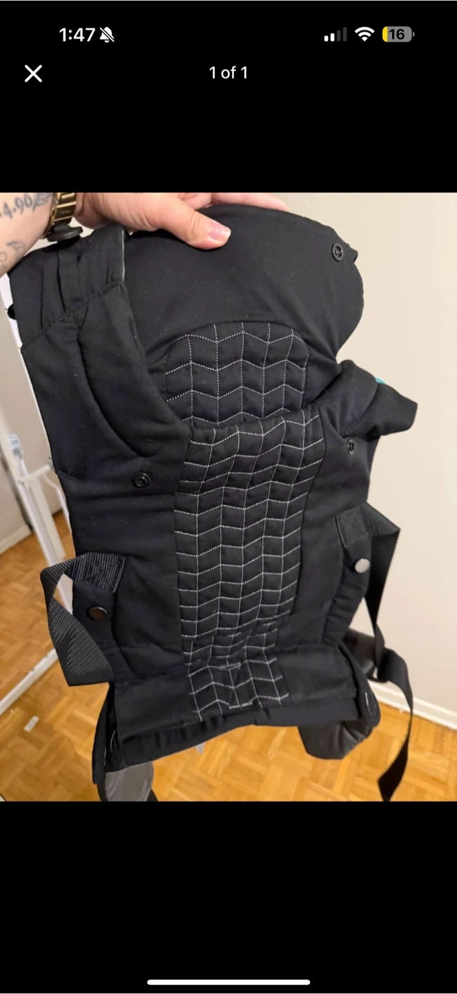 28Selling a baby carrier in black colour. It has a padded design with a quilted pattern on the front. Perfect for keeping your little one close and comfortable while you're on the go!
