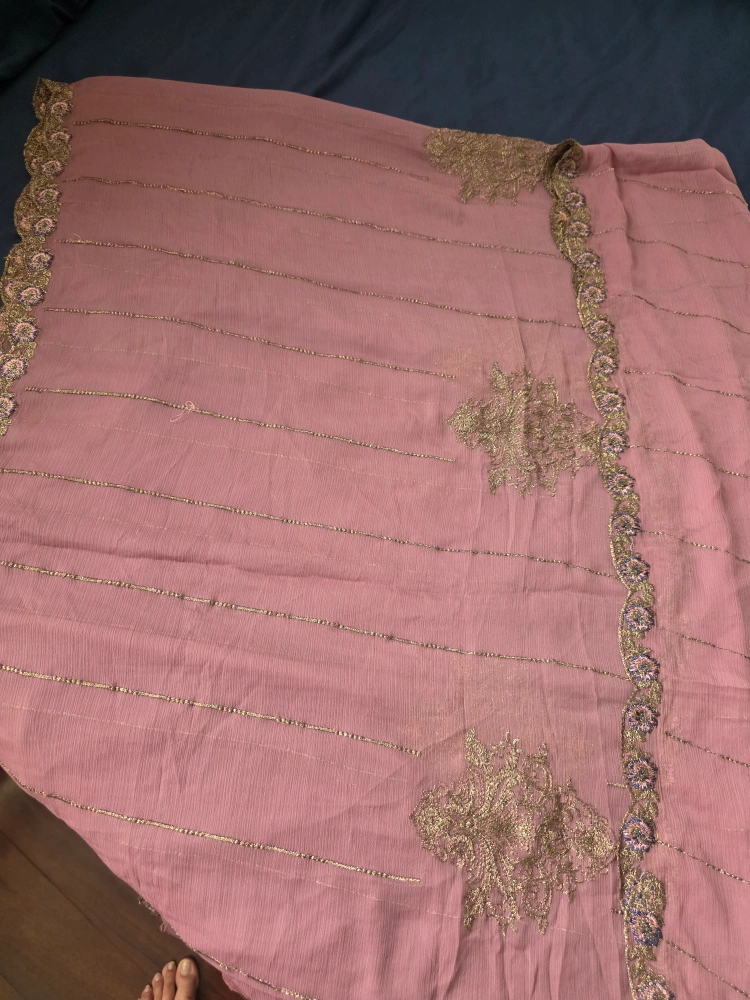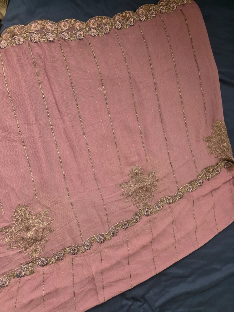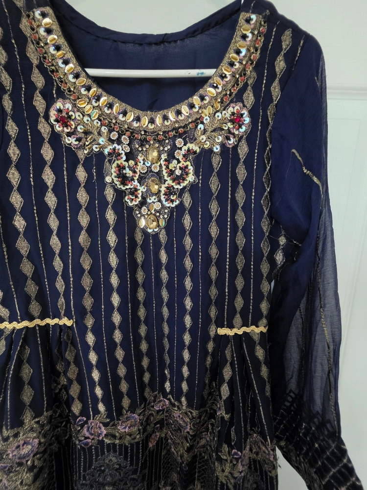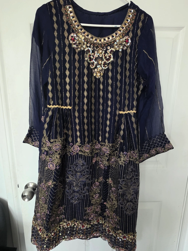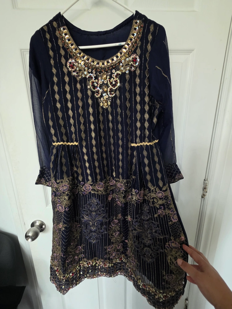Beautiful navy blue dress with intricate gold embroidery and beadwork. It comes with a matching pink embroidered dupatta. Perfect for a special occasion!