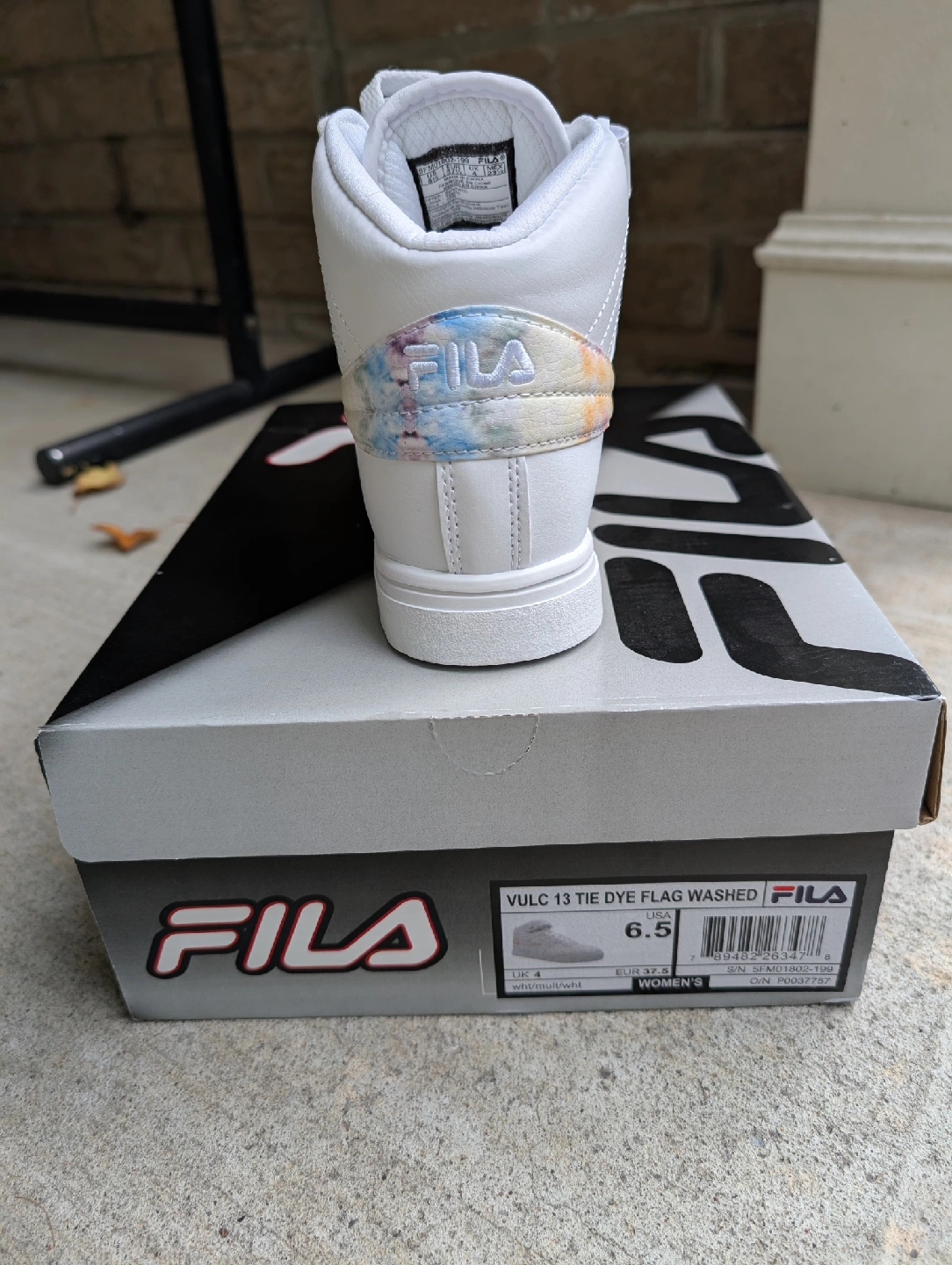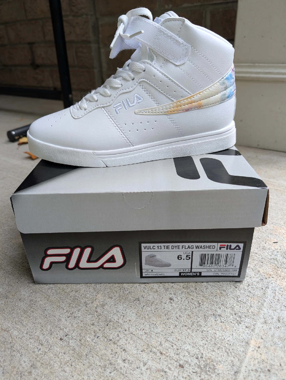 Selling a pair of Fila Vulc 13 Tie Dye Flag Washed sneakers in women's size 6.5. These stylish high-tops are in great condition and come with the original box. Perfect for adding a bit of retro flair to your wardrobe!