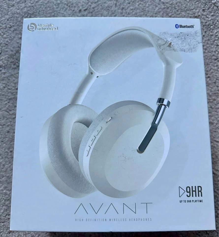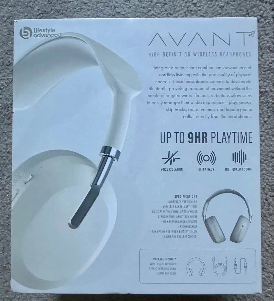 Avant High Definition Wireless Headphones by Lifestyle Advanced. Features: These headphones offer up to 9 hours of playtime and include noise isolation, ultra bass, and high-quality sound features. Connectivity: They connect wirelessly via Bluetooth (version 5.0) with a range of up to 30 feet (10m). Controls: Integrated buttons allow for easy control of music playback (play, pause, skip tracks), volume adjustment, and handling phone calls. Battery & Charging: They are rechargeable and offer an auxiliary option for wired listening when the battery is low (a 3.5mm AUX cable is included). Package Contents: The package includes the wireless headphones, a Type-C charging cable, and a 3.5mm AUX cable.