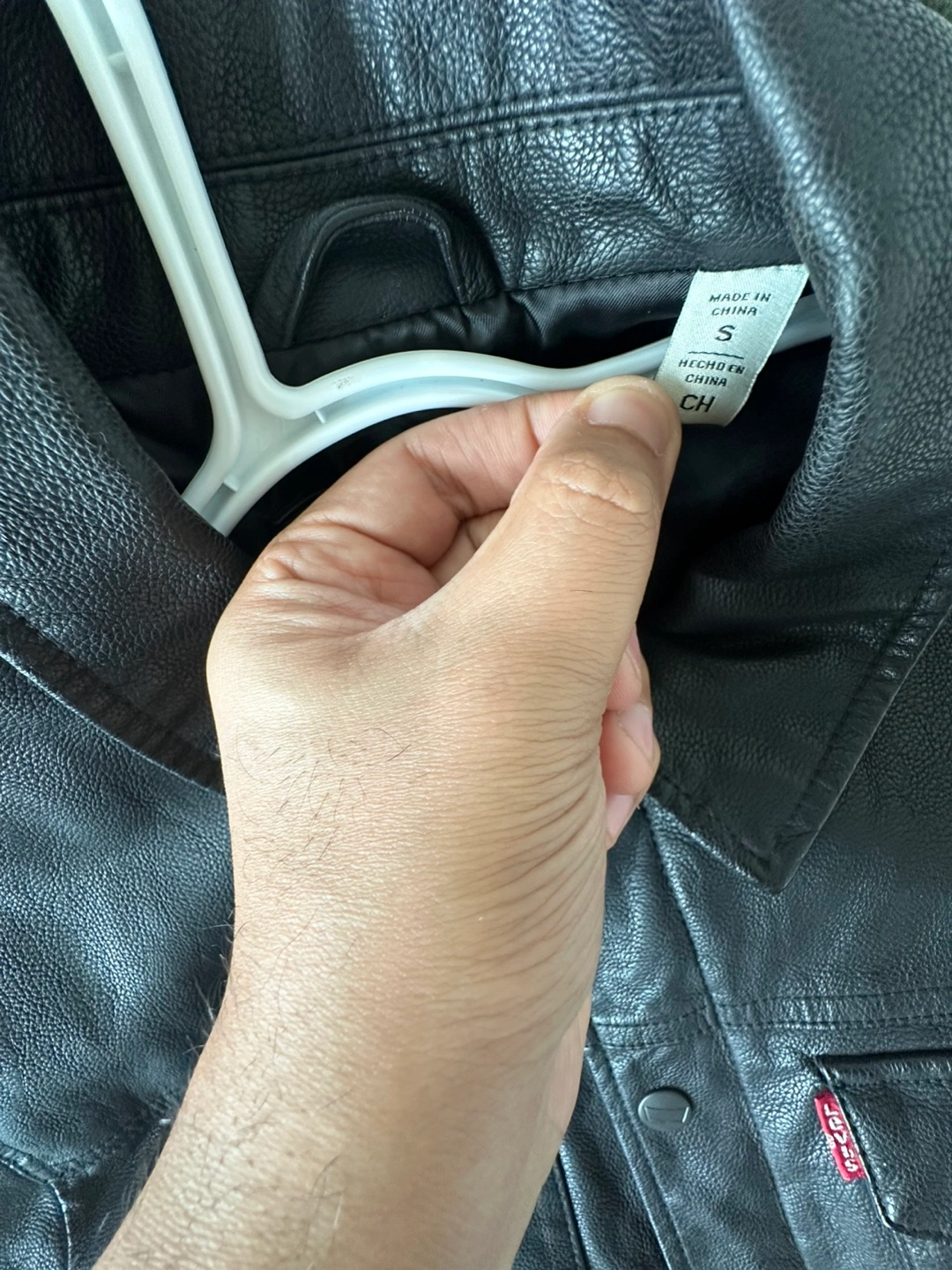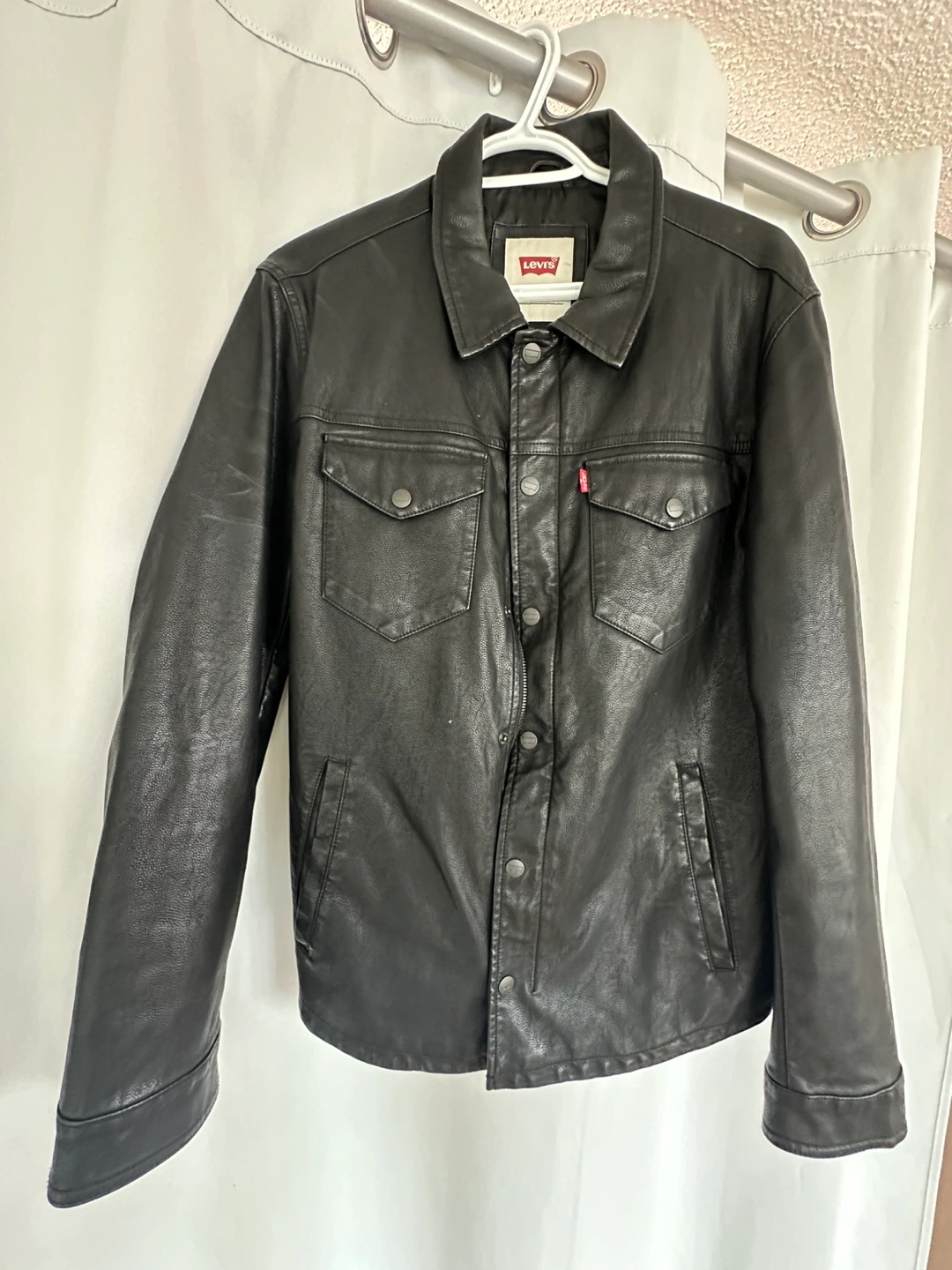 I'm selling a Levi's faux leather trucker jacket in black! It's in great condition and is a size small. Perfect for adding a bit of edge to your wardrobe. It is made in China!
