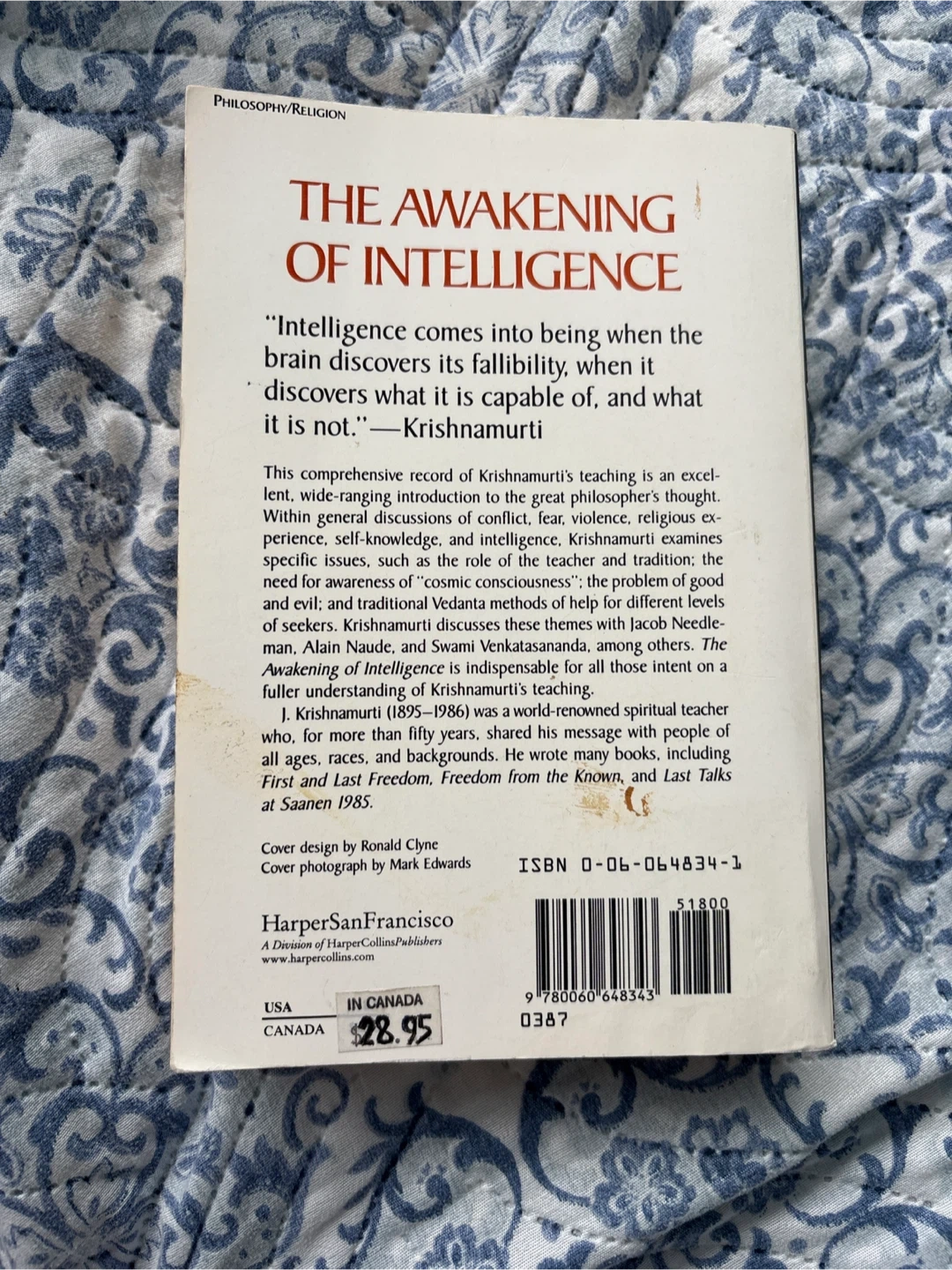 Selling a copy of "The Awakening of Intelligence" by J. Krishnamurti. This book falls under the Philosophy/Religion category. It originally retailed for $28.95 in Canada. A great read for anyone interested in self-knowledge and intelligence
