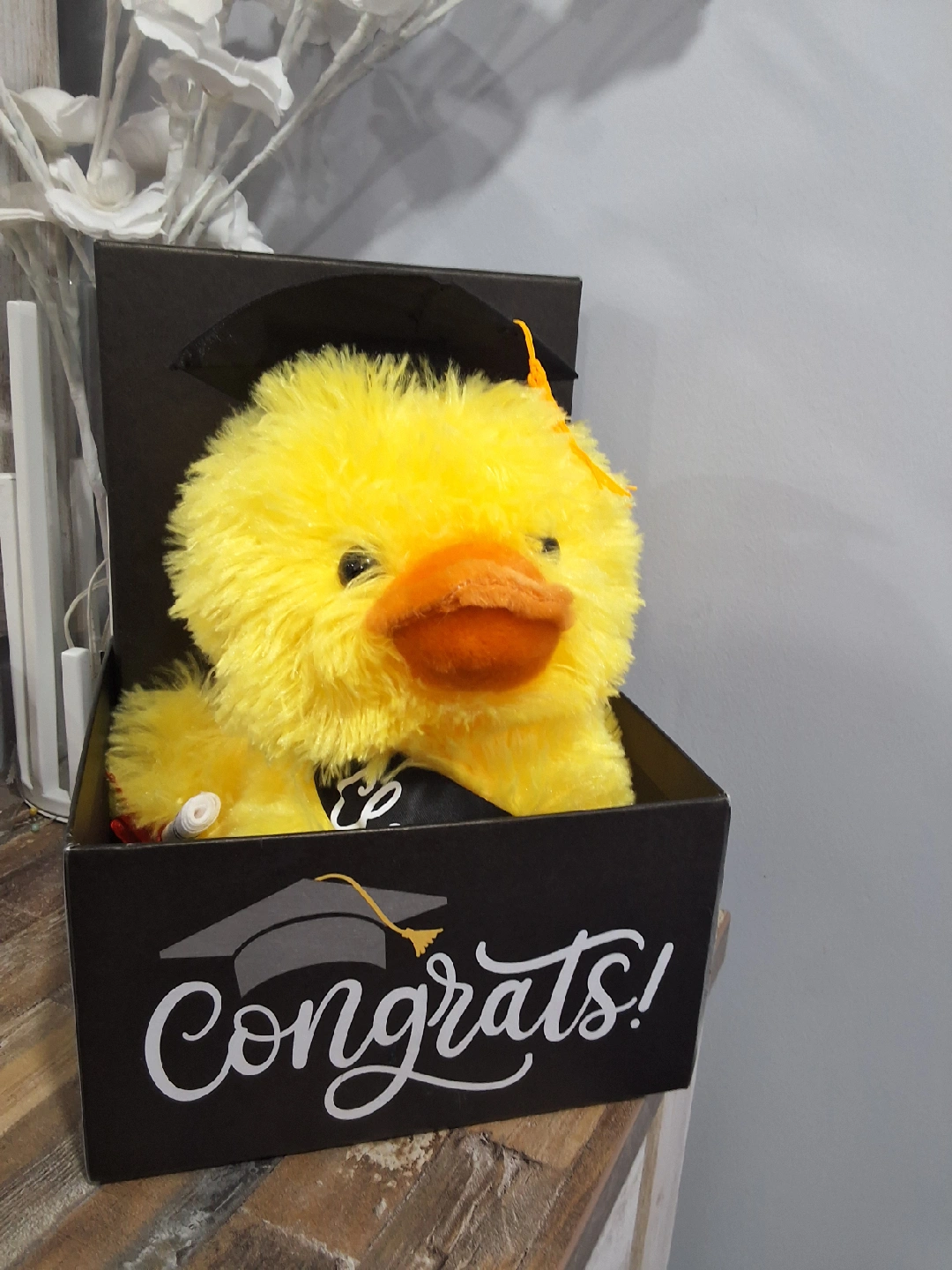 This adorable yellow plush duck is ready to celebrate graduation! It comes complete with a graduation cap, diploma, and a sash that says 'Class of'. The duck is in excellent condition and comes in its original box, which is decorated with a graduation-themed design. Perfect as a gift or a cute addition to your graduation decor!