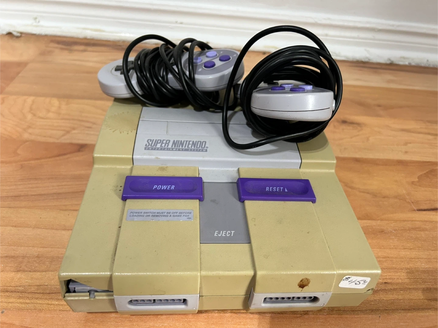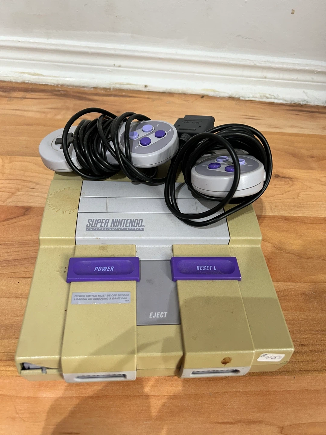 For sale: A classic Super Nintendo Entertainment System (SNES) console with 2 original controllers! This 90s gaming icon shows some yellowing and minor wear typical of its age but appears to be in good used condition. Perfect for retro gaming enthusiasts looking to relive classics like Mario, Zelda, or Street Fighter. Includes: SNES console and 2 controllers Condition: Used. No additional cables or games included.