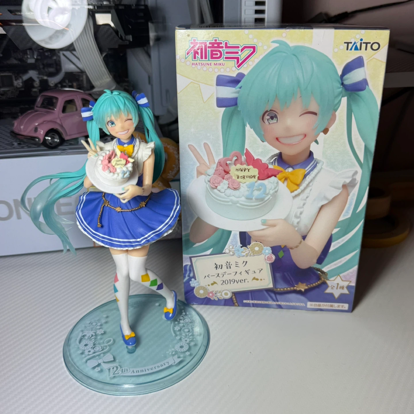 Hatsune Miku 2019 Birthday Ver. prize figure!! It features her holding a birthday cake. This includes the original box!! Please message me if there are any questions :)!!