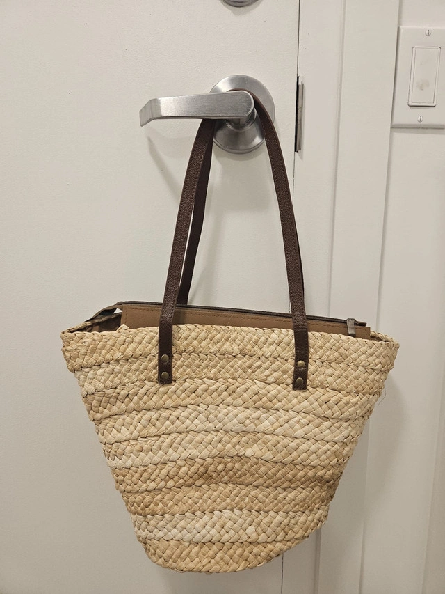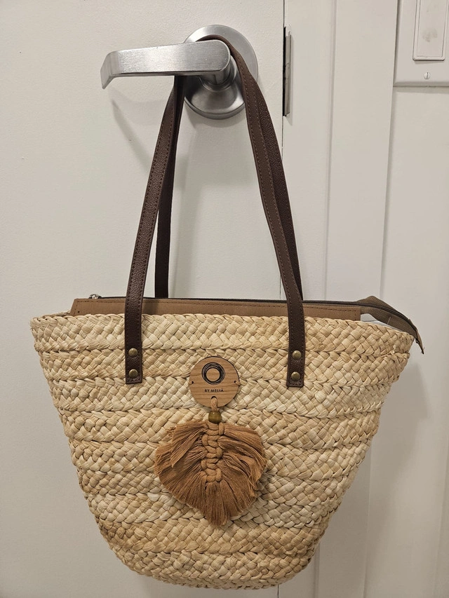 This elegant straw tote blends natural materials with modern touches perfectly! Featuring brown leather handles and a chic tassel detail, it’s an ideal accessory for everyday use. The zippered closure keeps your belongings secure. Perfect for transitioning from beach to city life.