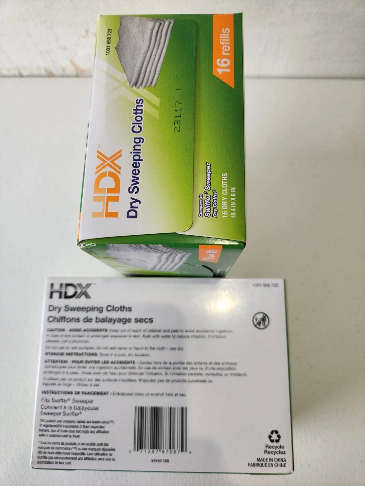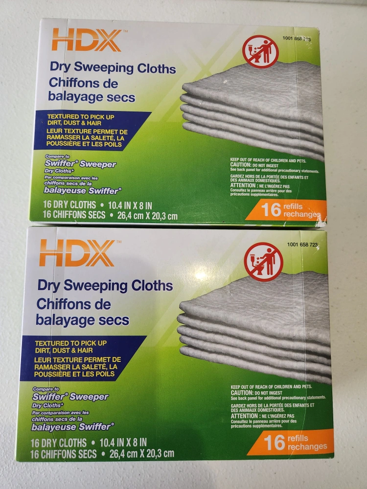 Selling a box x 2 of HDX Dry Sweeping Cloths! These are textured to pick up dirt, dust, and hair, and are comparable to Swiffer Sweeper Dry Cloths. Each box contains 16 dry cloths, sized at 10.4 in x 8 in (26.4 cm x 20.3 cm). Perfect for keeping your floors clean and tidy! Both for $5 ( 2 Boxes ) Check out my other Ads Thank you