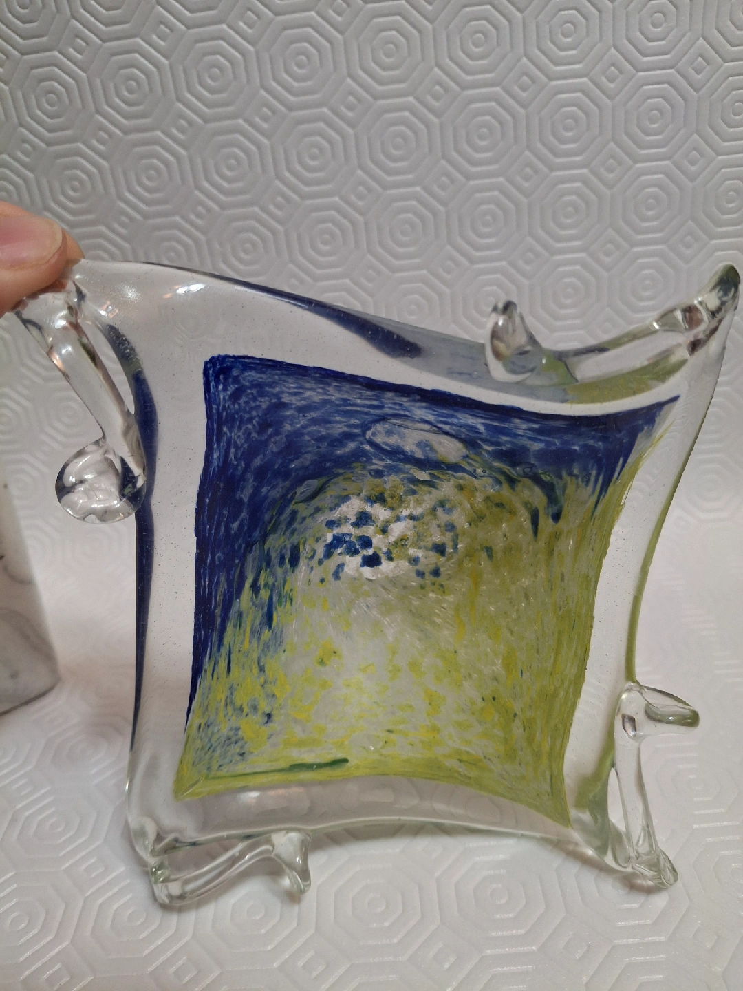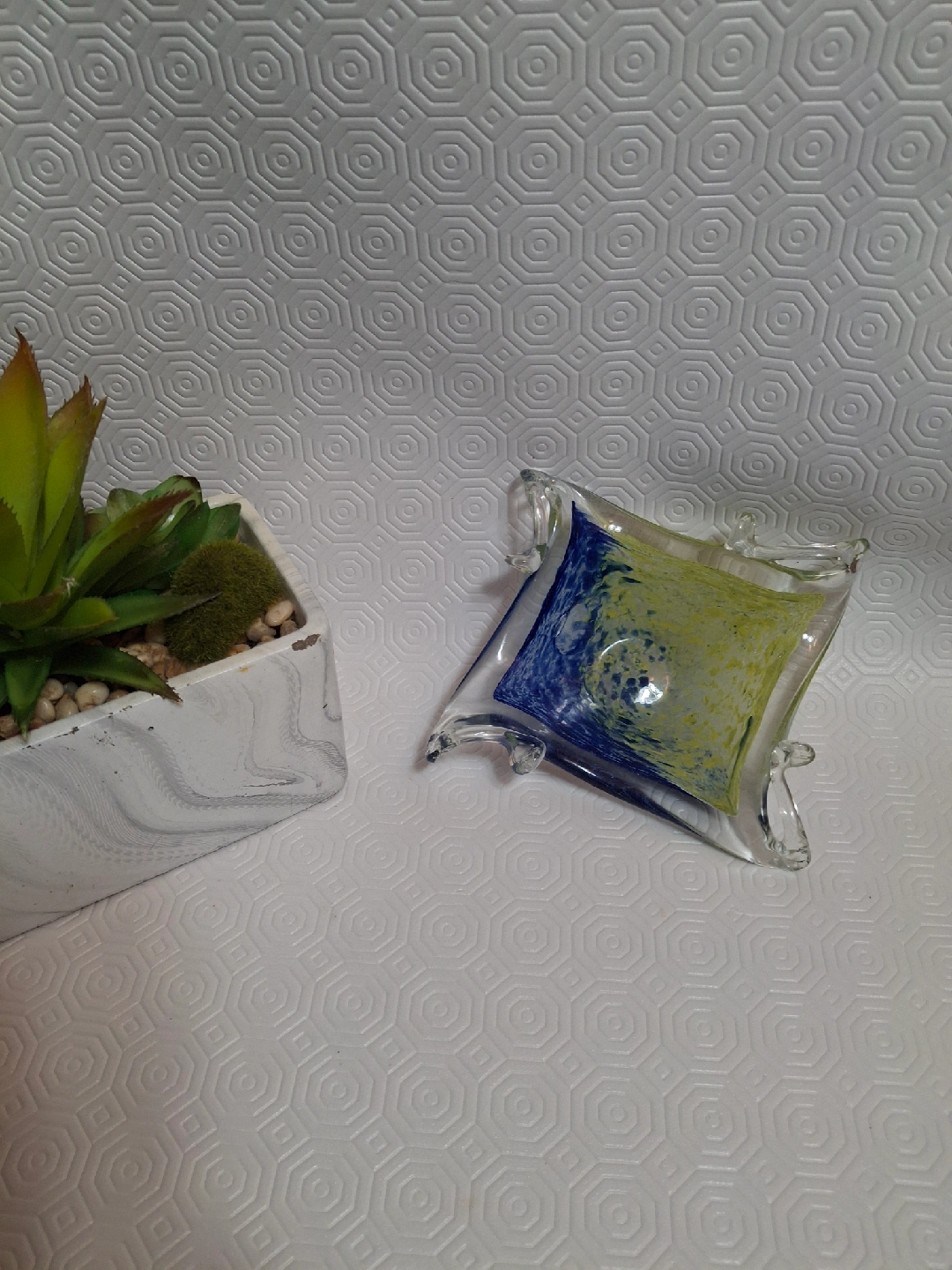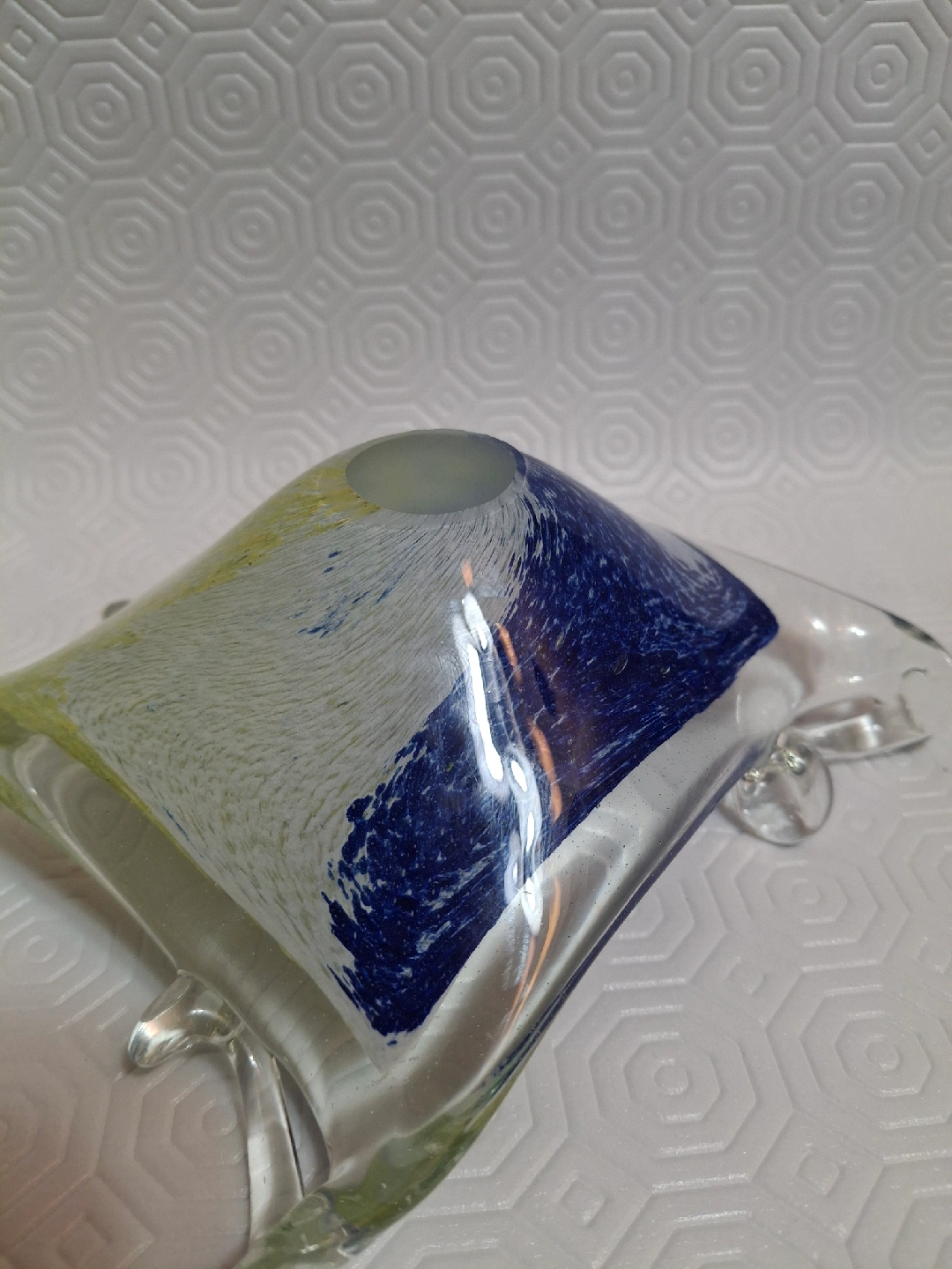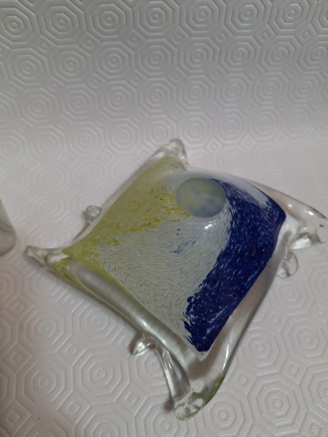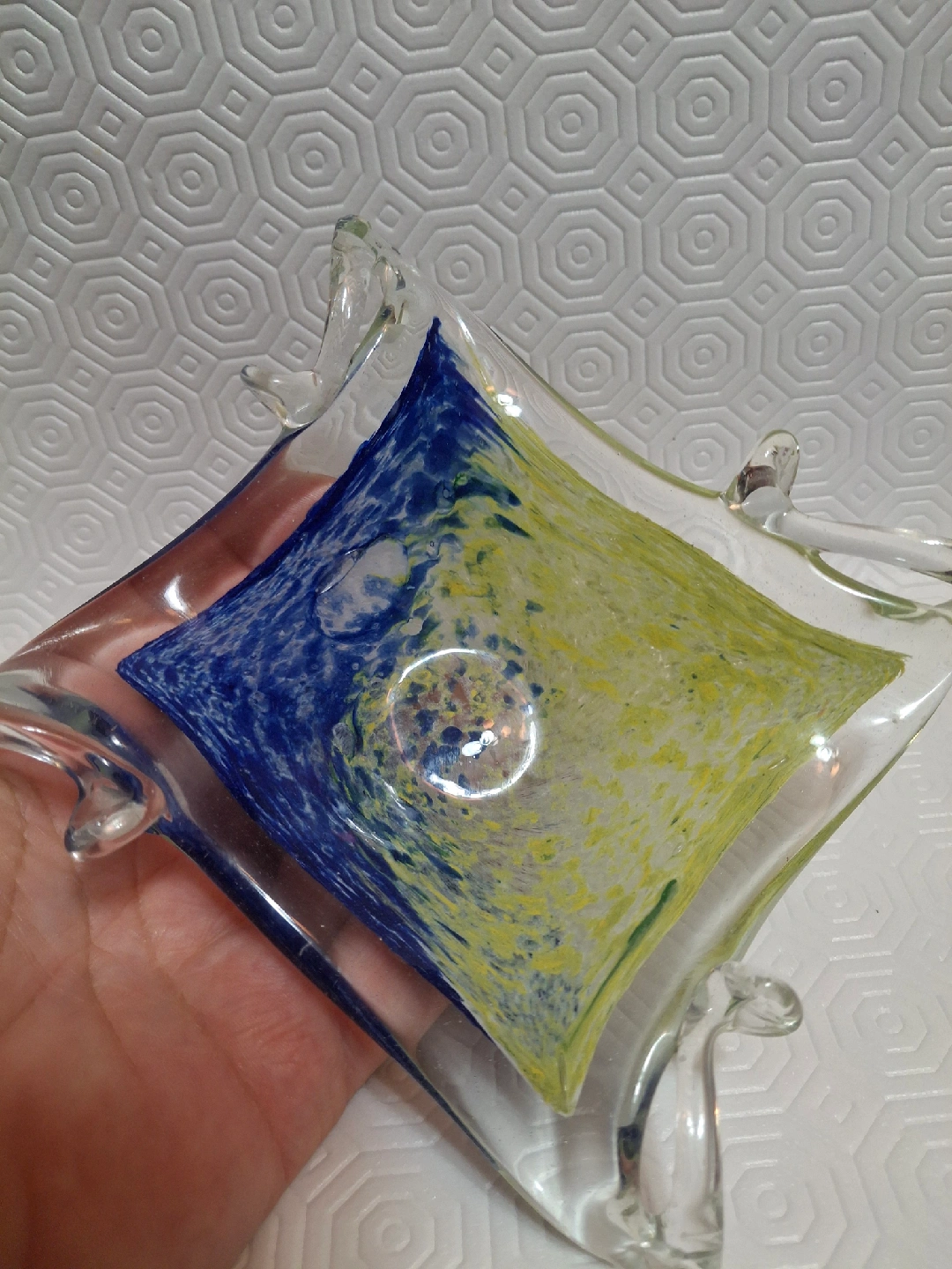 Unique art glass bowl with a beautiful blend of blue and yellow colours. It's in great condition and would make a lovely addition to any home decor. Murano Glass style
