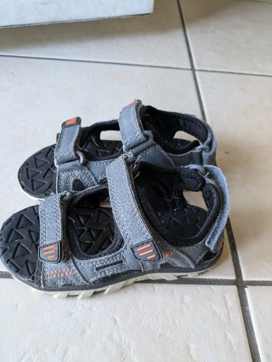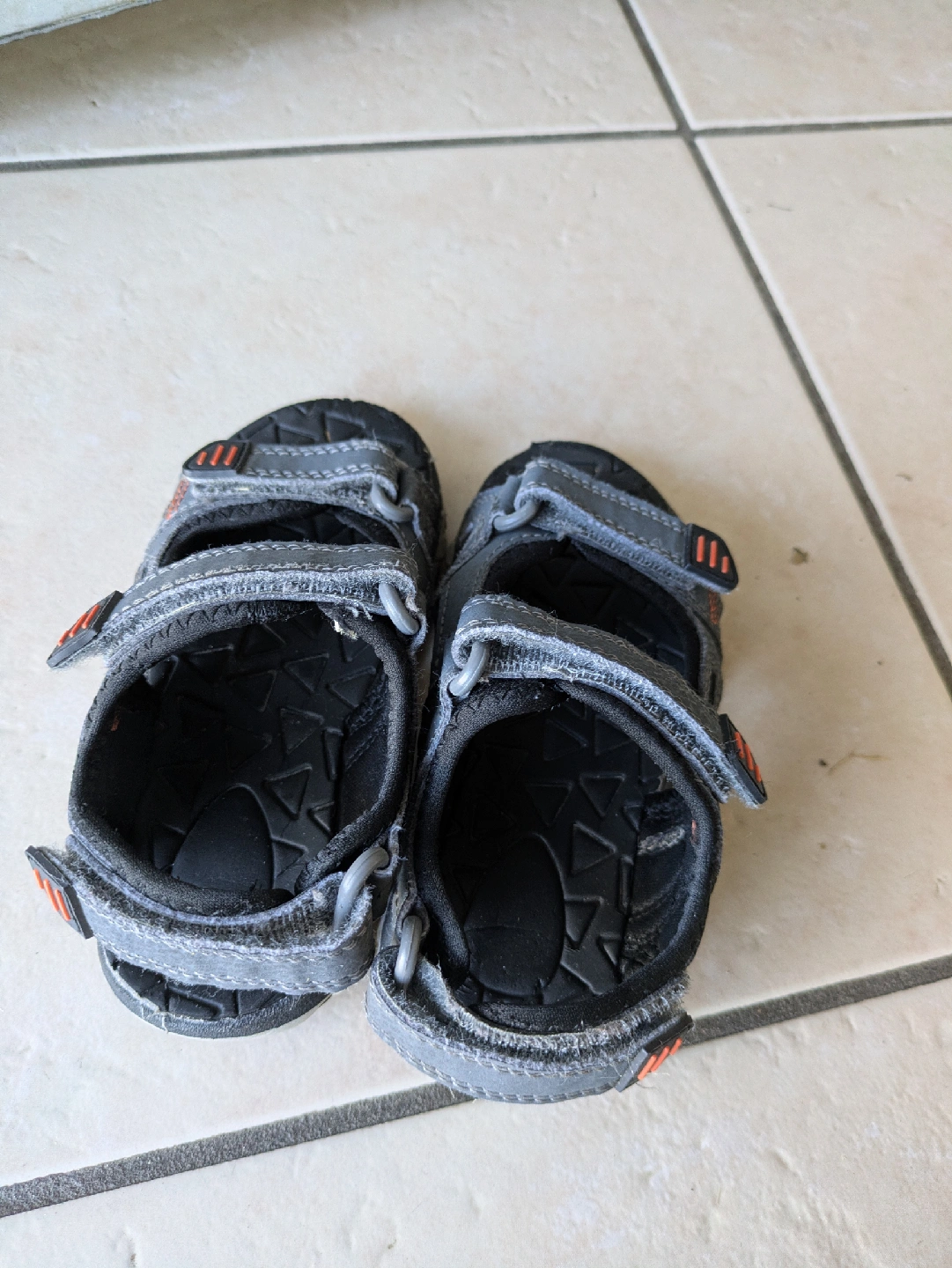 31These are a cute pair of grey sandals for kids! They are in good condition and are a size 10. Perfect for summer adventures and easy to put on and take off