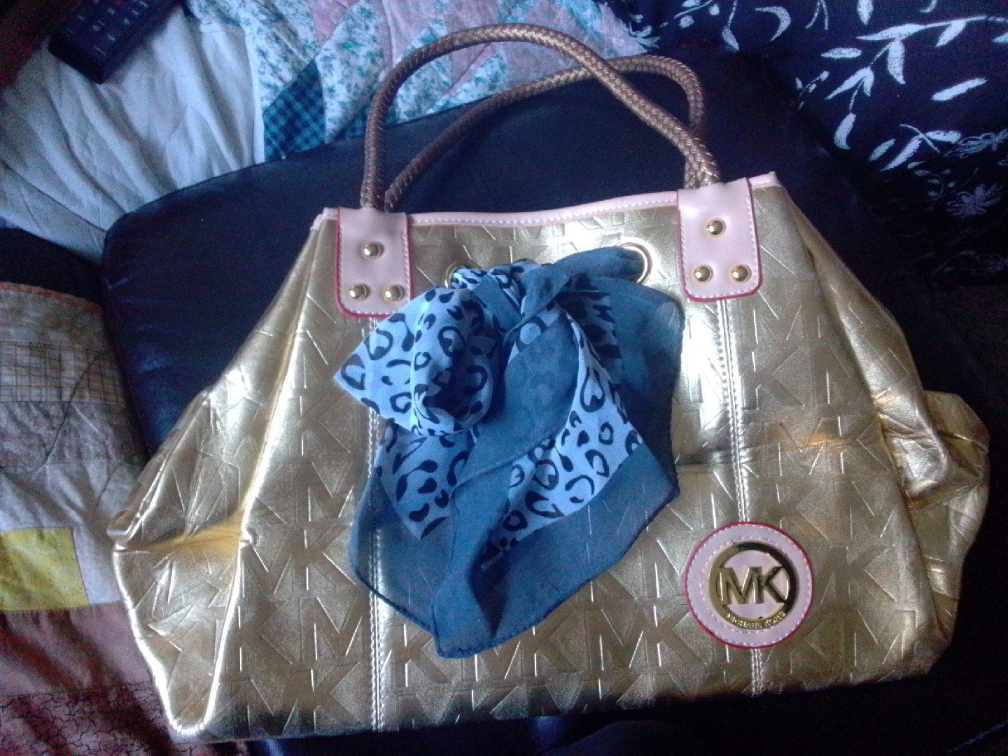 Selling a Michael Kors tote bag in gold. It's in good condition and perfect for everyday use or a night out. The bag features the MK logo pattern and comes with braided handles.