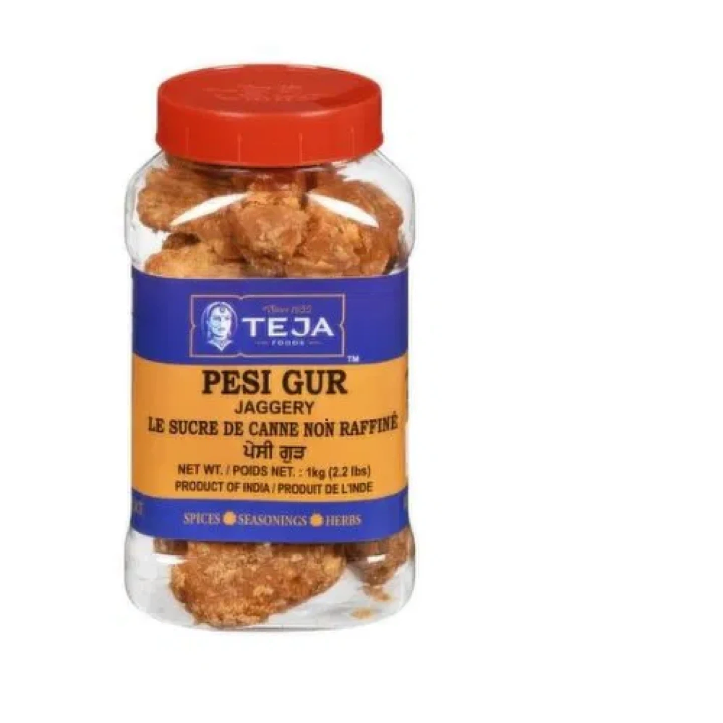 Selling a jar of Teja Pesi Gur Jaggery. It's a 1kg jar of unrefined cane sugar from India, perfect for adding a touch of sweetness to your spices, seasonings, and herbs