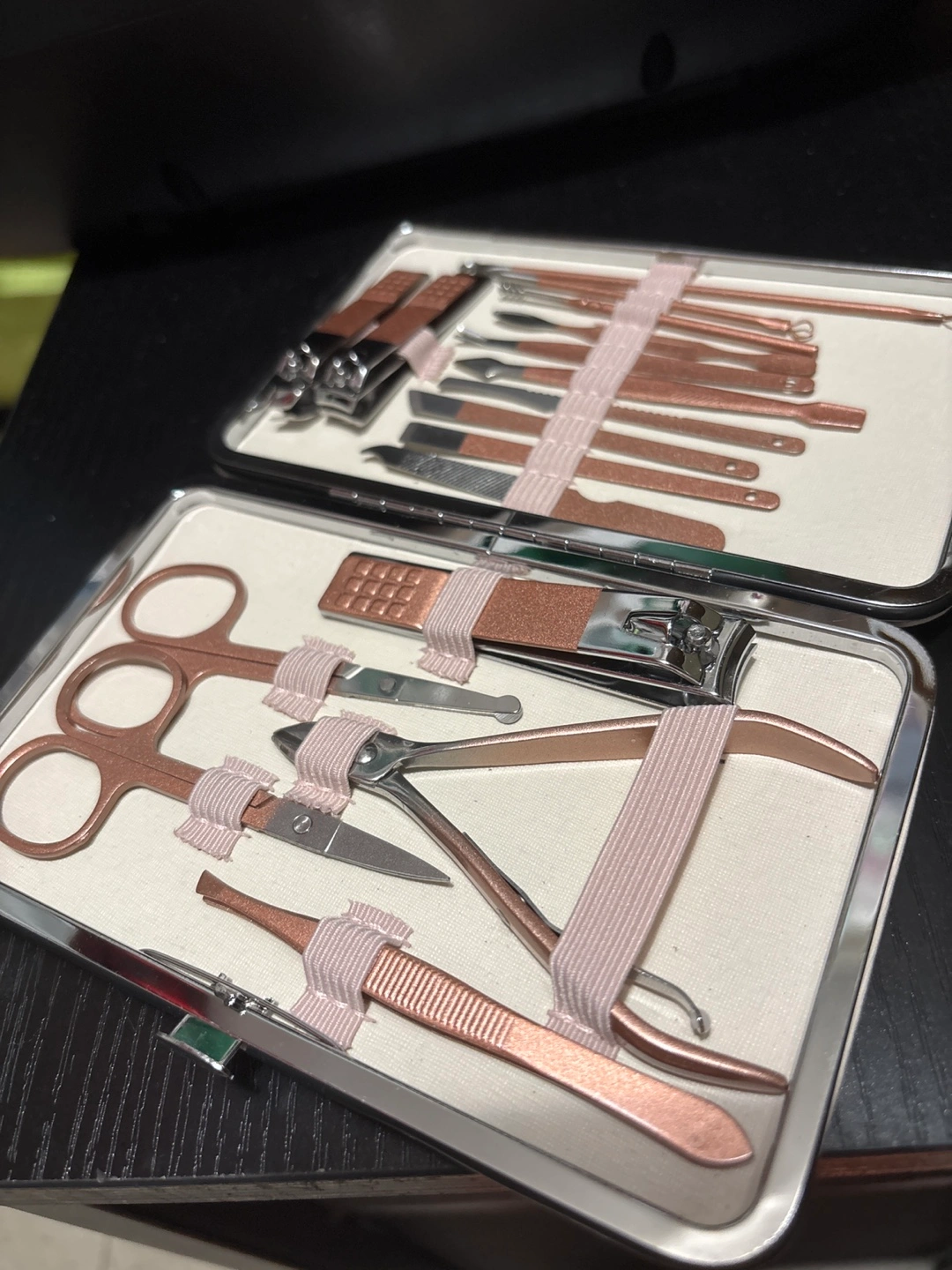 Selling a complete manicure set in a stylish rose gold finish. It includes all the essential tools you need for a perfect manicure at home. The set comes in a compact case, making it easy to store and travel with