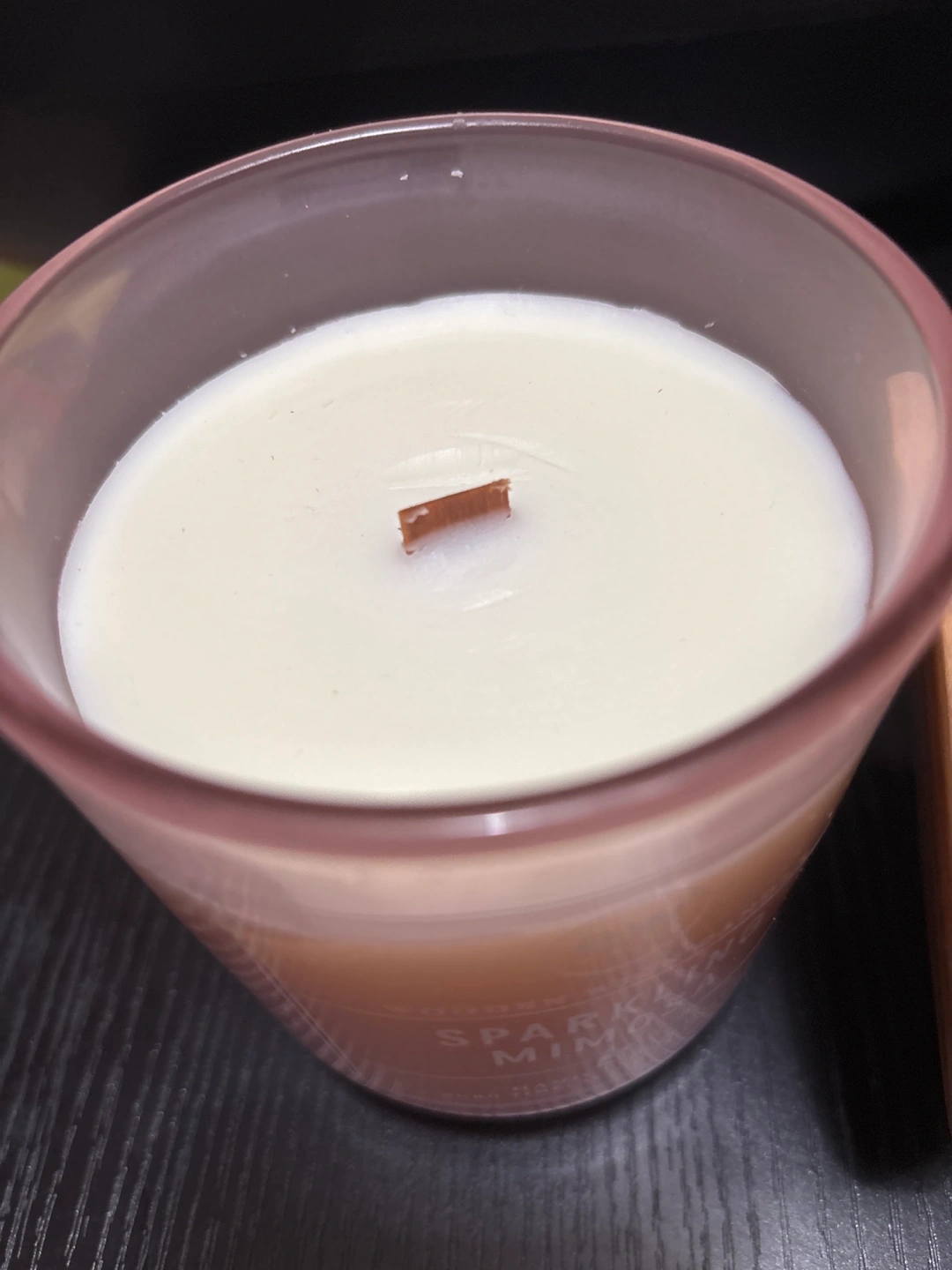 Selling a DW Home Wooden Wick Candle in the Sparkling Mimosa scent! It has pure shimmers of spring water and a splash over the juicy sweetness of summer watermelon and green honeydew, enhanced with aromatic hints of crushed rosemary