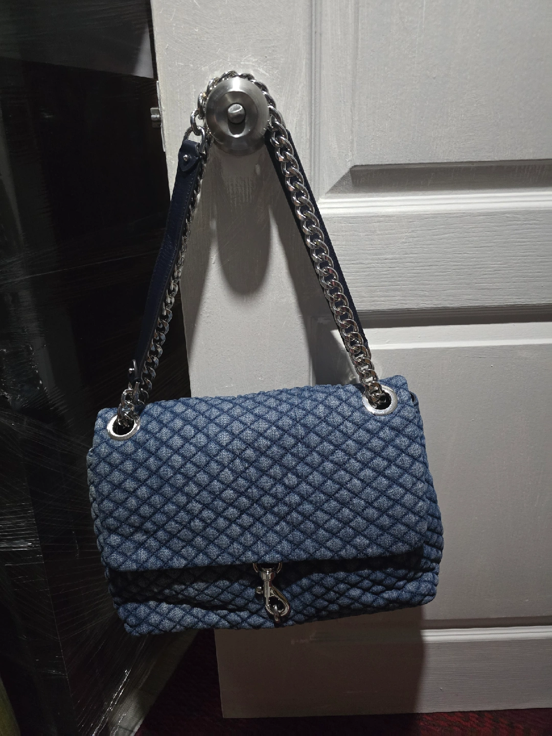 60Selling a stylish Rebecca Minkoff shoulder bag! It features a unique denim quilted design with a silver chain strap. Perfect for adding a touch of casual elegance to any outfit!