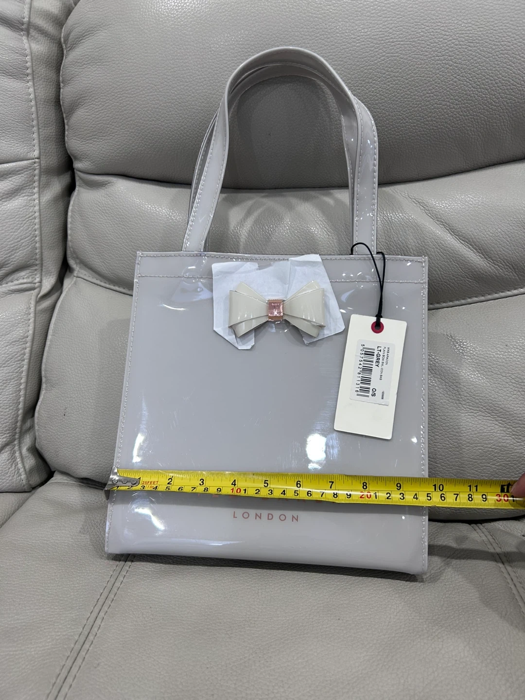 This is a Ted Baker London tote bag in a light grey colour. It's in brand new condition and features a cute bow detail. The bag is perfect for carrying your essentials and adding a touch of style to your outfit