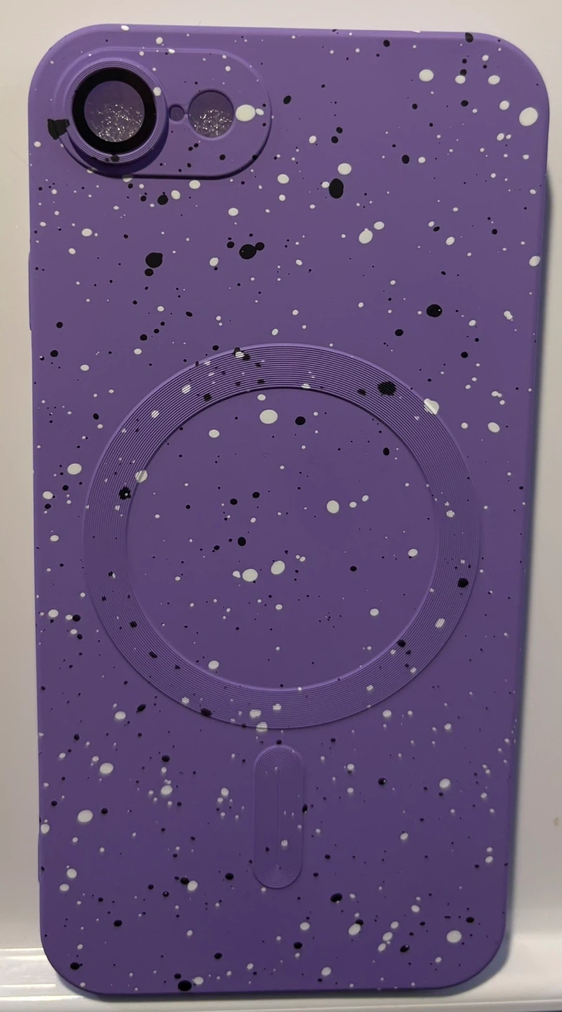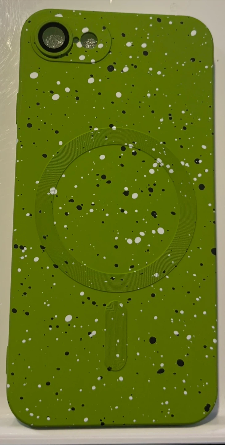 iPhone Case in either green or purple with a fun splatter design. It has magsafe and lens protectors. Perfect for protecting your phone with a bit of style