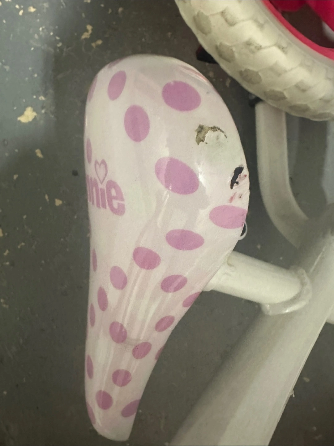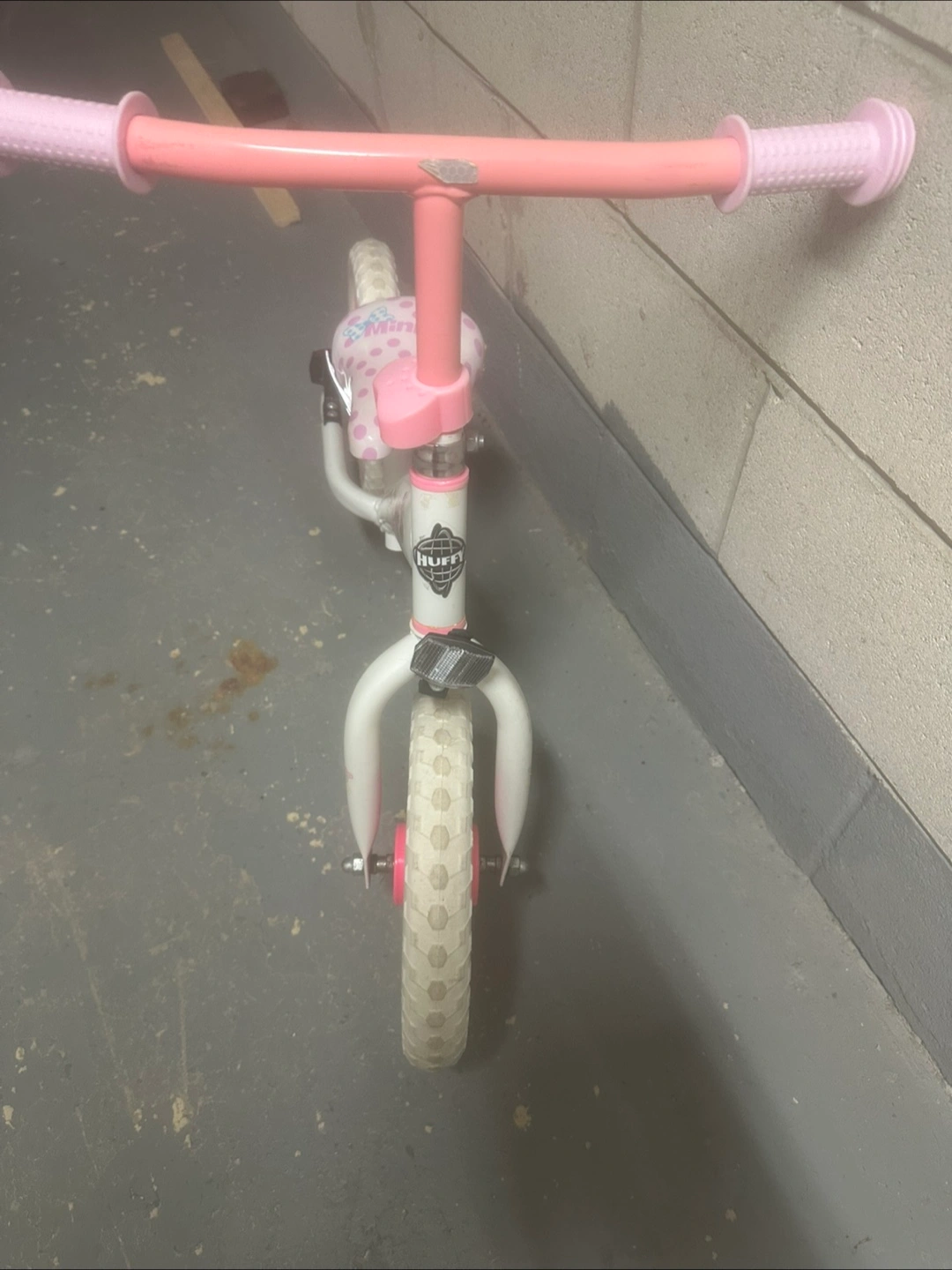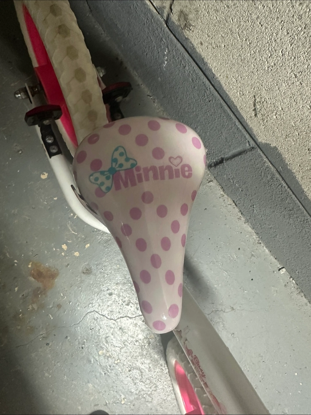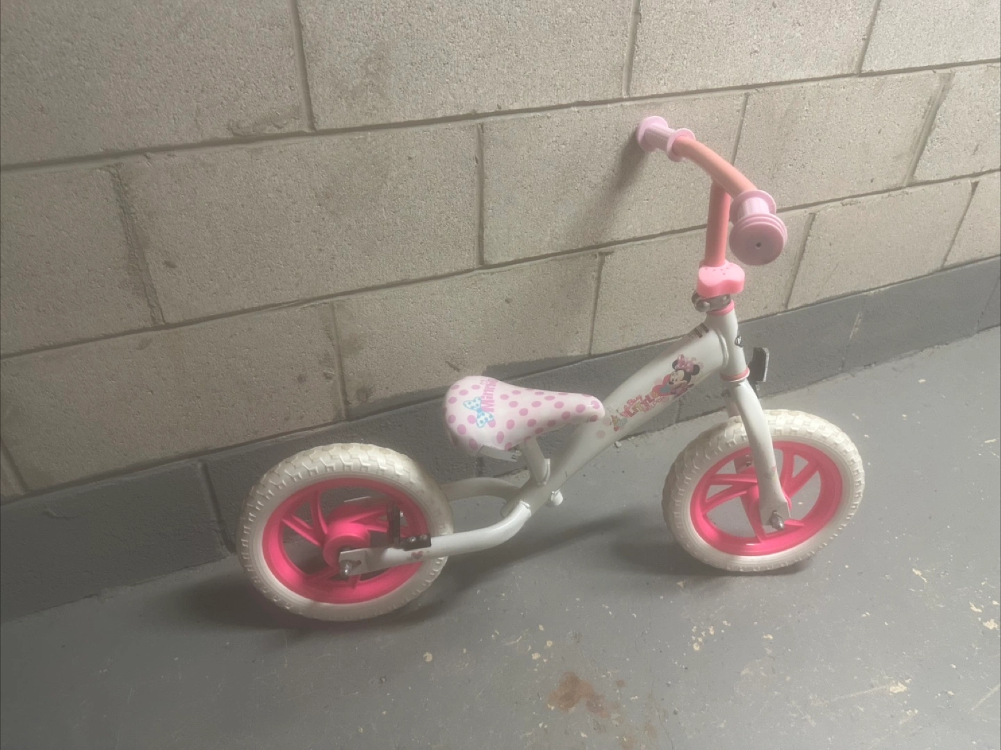 Selling a Huffy balance bike featuring Minnie Mouse details! It's white and pink, perfect for a little one learning to balance before riding a pedal bike. The seat has a cute Minnie Mouse design with polka dots