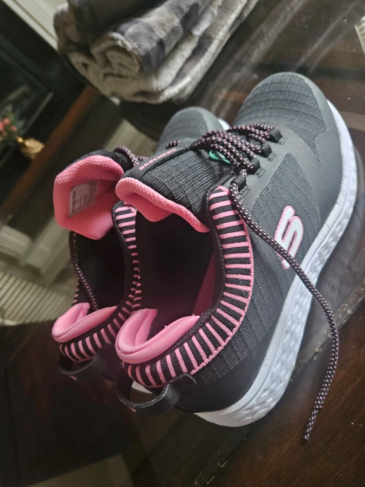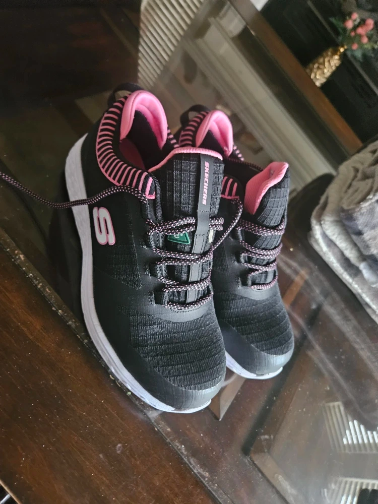 Selling a pair of Skechers ladies' shoes in black with pink accents. They're in great condition and ready for a new home!