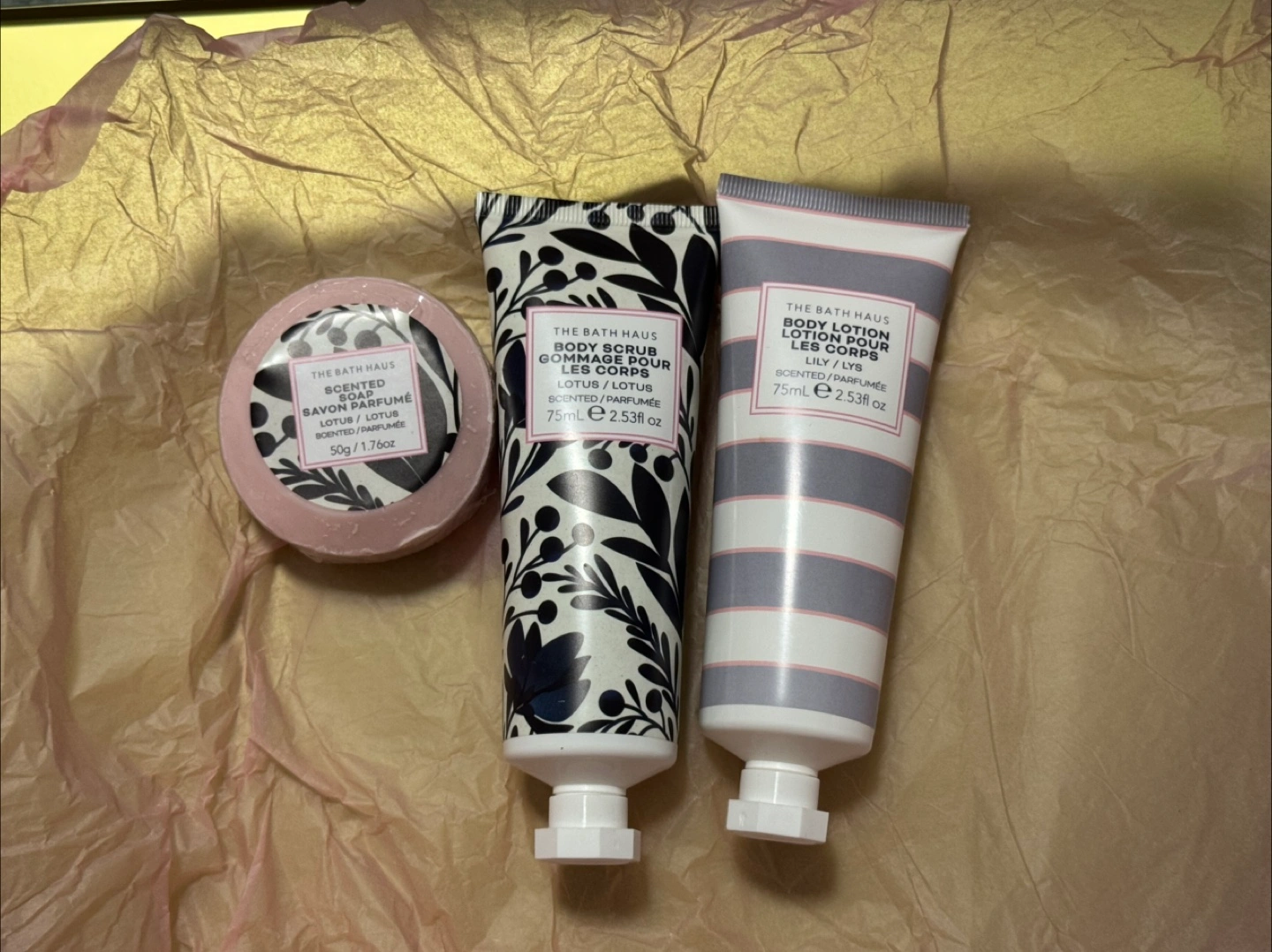 Giving a set of The Bath Haus products. This includes a scented soap, body scrub, and body lotion, all in the Lotus & Lily scent. Each item is 75ml/2.53 fl oz, except for the soap which is 50g/1.76oz. Brand new never used