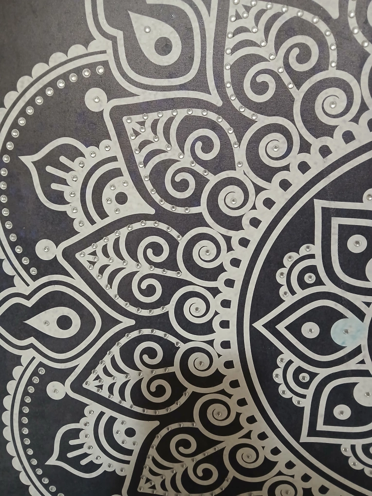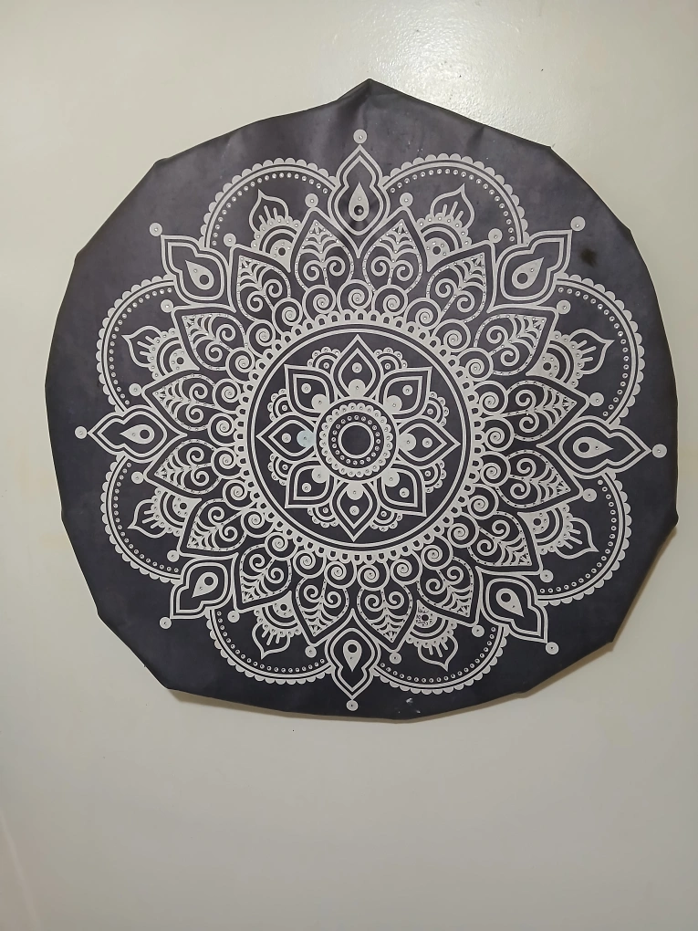 Beautiful mandala wall art in black and white! It has a unique design and would look great in any room. It's in excellent condition and ready to brighten up your space. Adorned with tiny rhinestones. This is a special material with a cardboard enclosure for sturdiness while hanging.