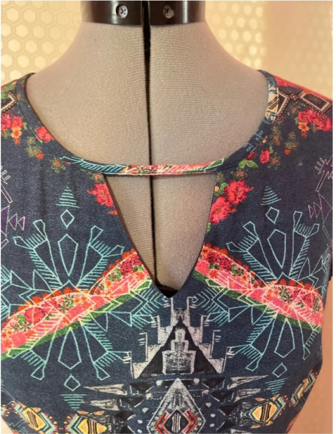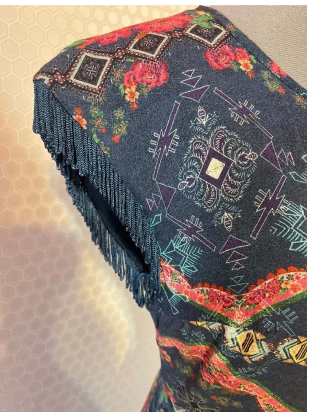 A beautifully unique bohemian maxi dress featuring a vibrant tribal/Aztec floral print and delicate fringe sleeves. This piece is from Antix, a beloved Brazilian boutique brand known for artistic prints, feminine silhouettes, and high-quality viscose fabric.