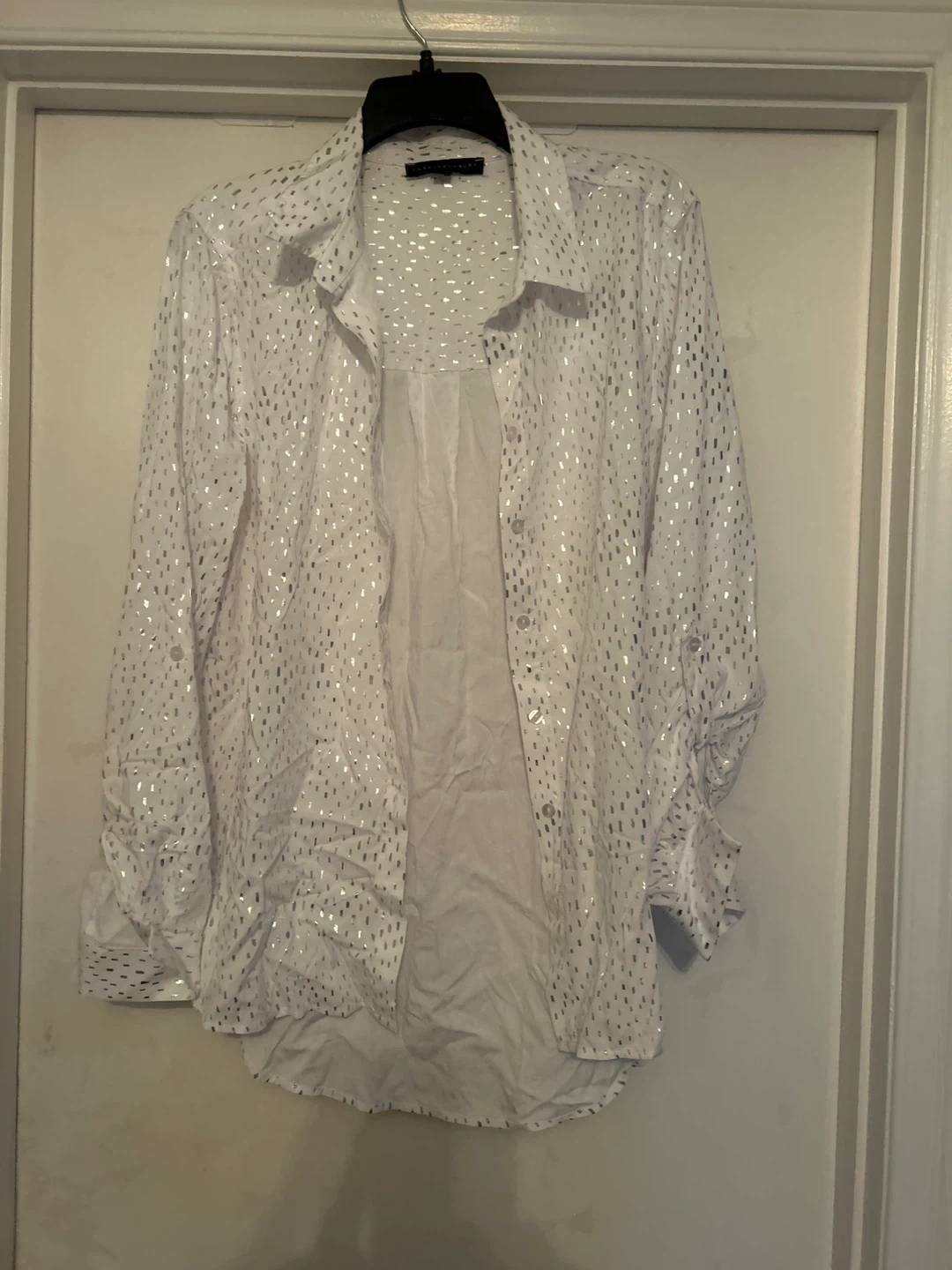 248Selling a Jane + Delancey blouse in size XL! It's a lovely white colour with silver detailing. Perfect for adding a bit of sparkle to your outfit! Wear it botton up or open, sleeves can be rolled up or left down .