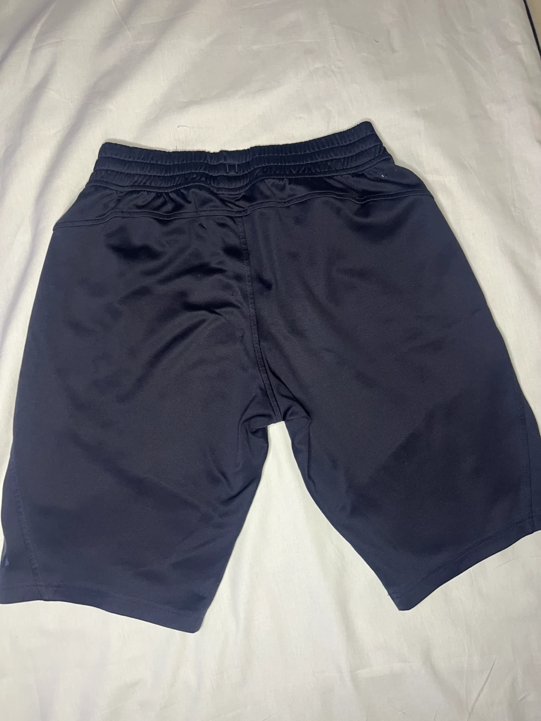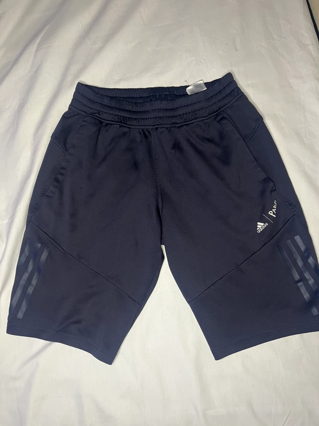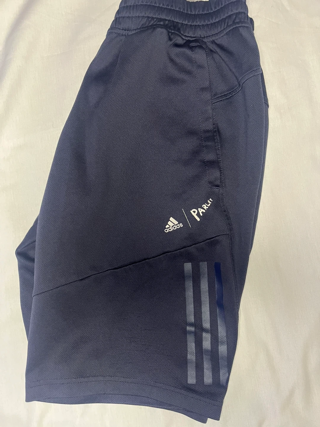 These dark blue Adidas shorts are made with Parley Ocean Plastic. They feature the classic three-stripe design on the sides. Perfect for training or casual wear!