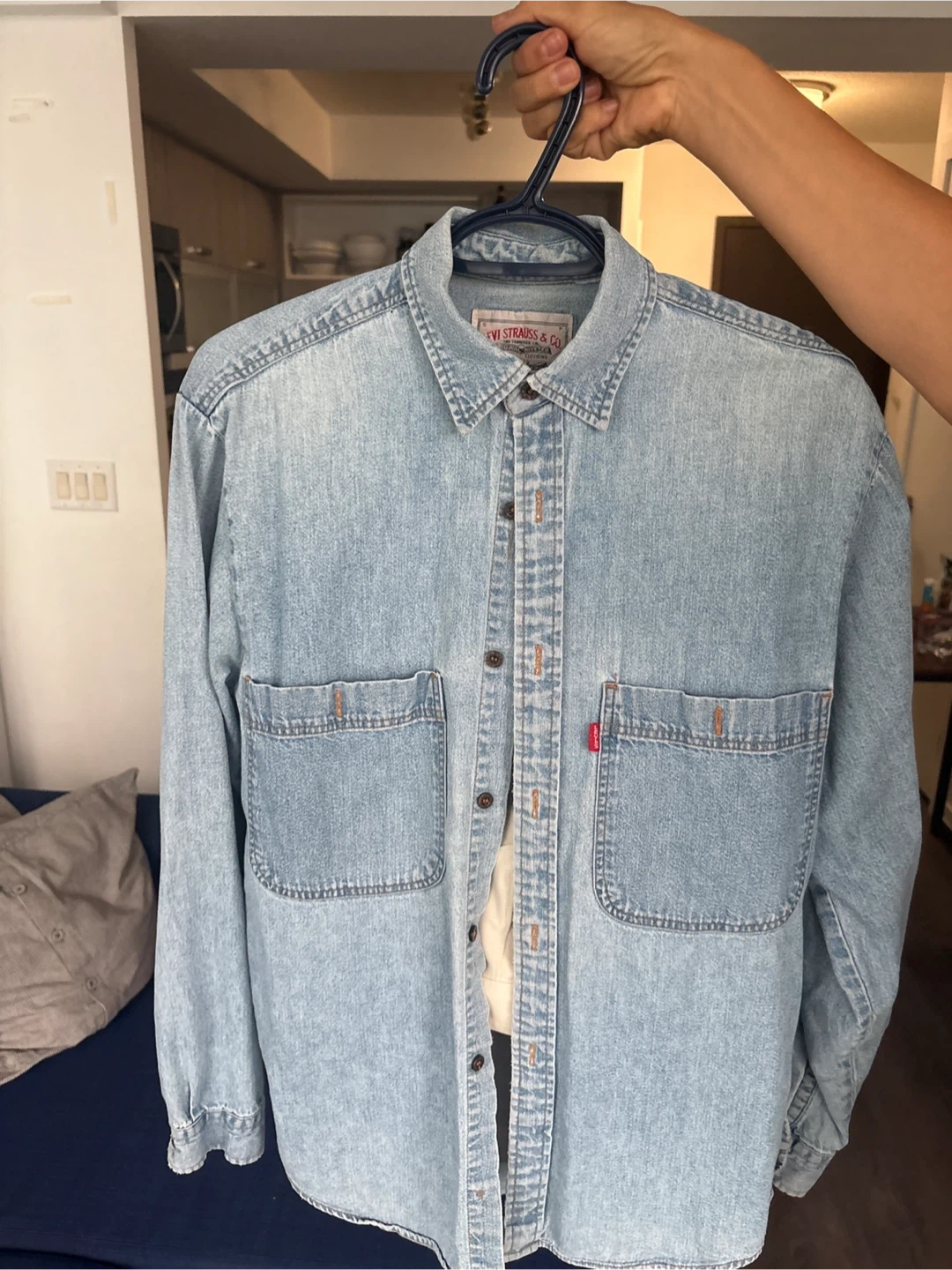 Levi's denim shirt in a light wash. It has two front pockets and a classic button-down style. Great for layering or wearing on its own!