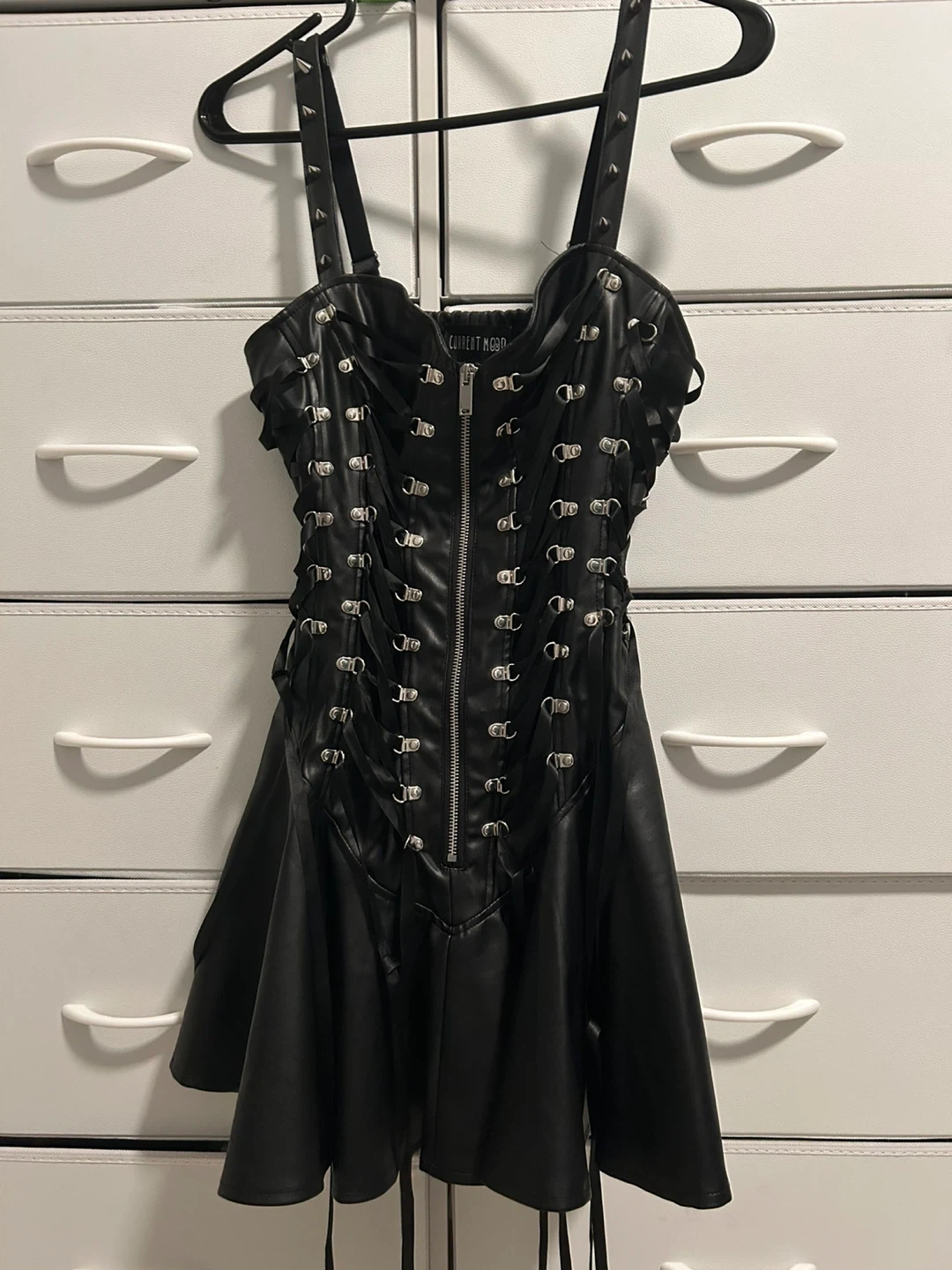 Selling a Dolls kill black dress in size medium. It has a unique design with eyelet and lace-up detailing. Great for a night out or a special occasion!