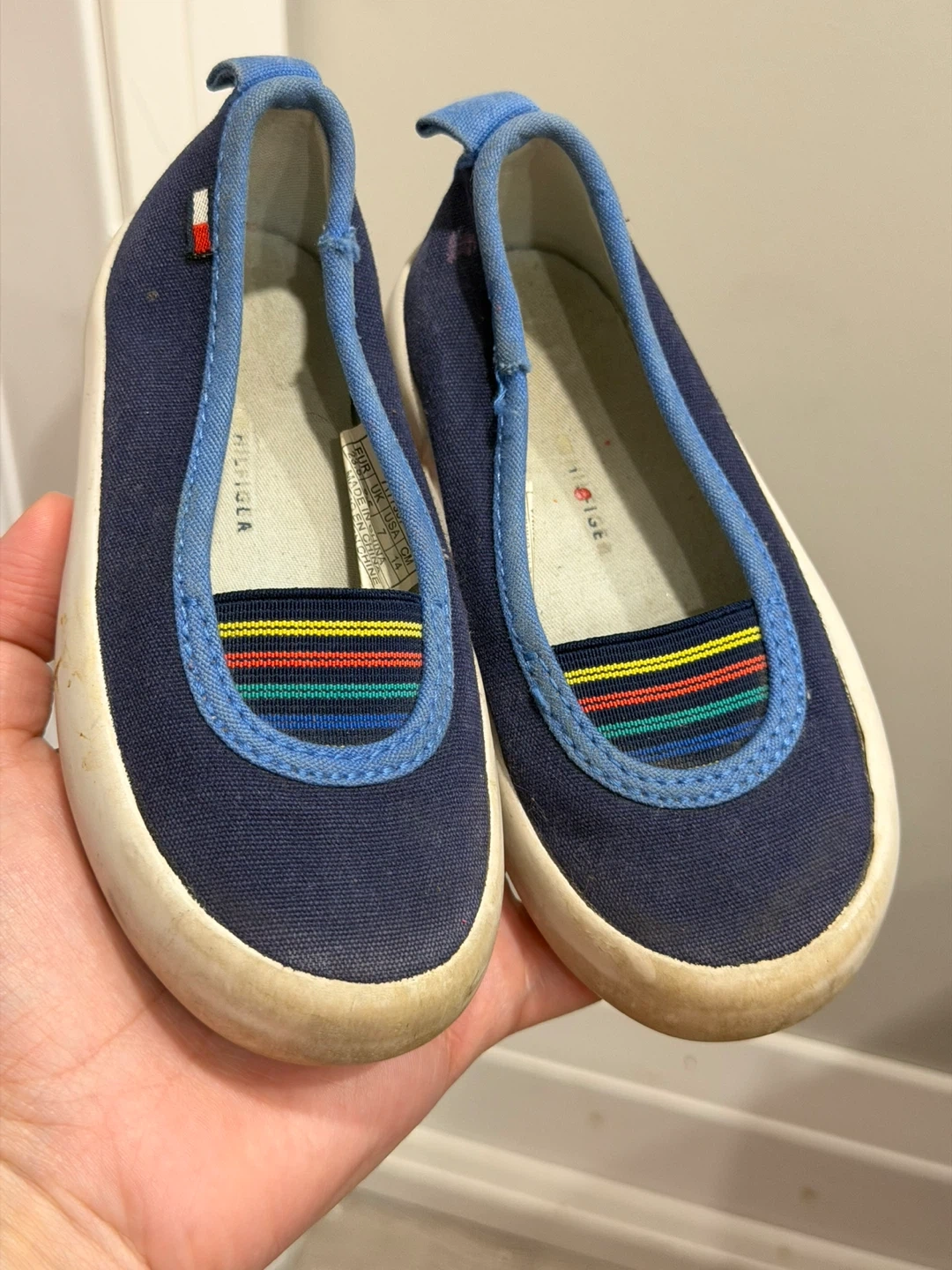 Tommy Hilfiger kids slip-on shoes in navy blue. Size 14. These shoes have a colourful stripe detail and are in good condition for everyday wear