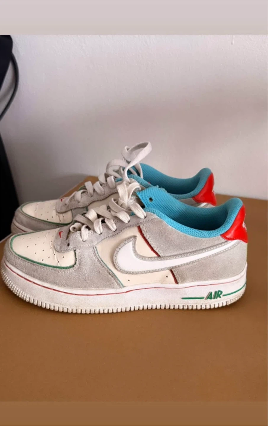 Selling a pair of Nike Air Force 1 sneakers! They feature a unique colour scheme with white, grey, blue, and red accents. Perfect for adding a pop of colour to your wardrobe