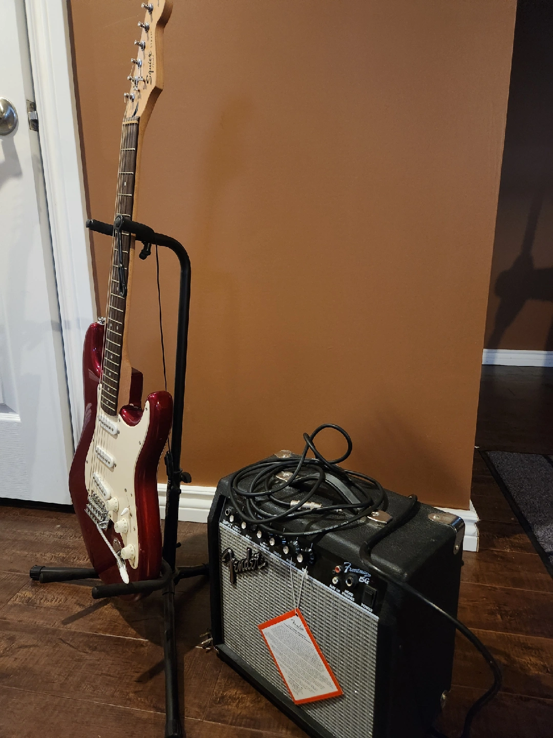 Selling a Squier Strat by Fender guitar along with a Fender Frontman 15G amplifier. Both are in great shape and ready for a new home! The guitar is a beautiful red colour and the amp is perfect for practice or small gigs