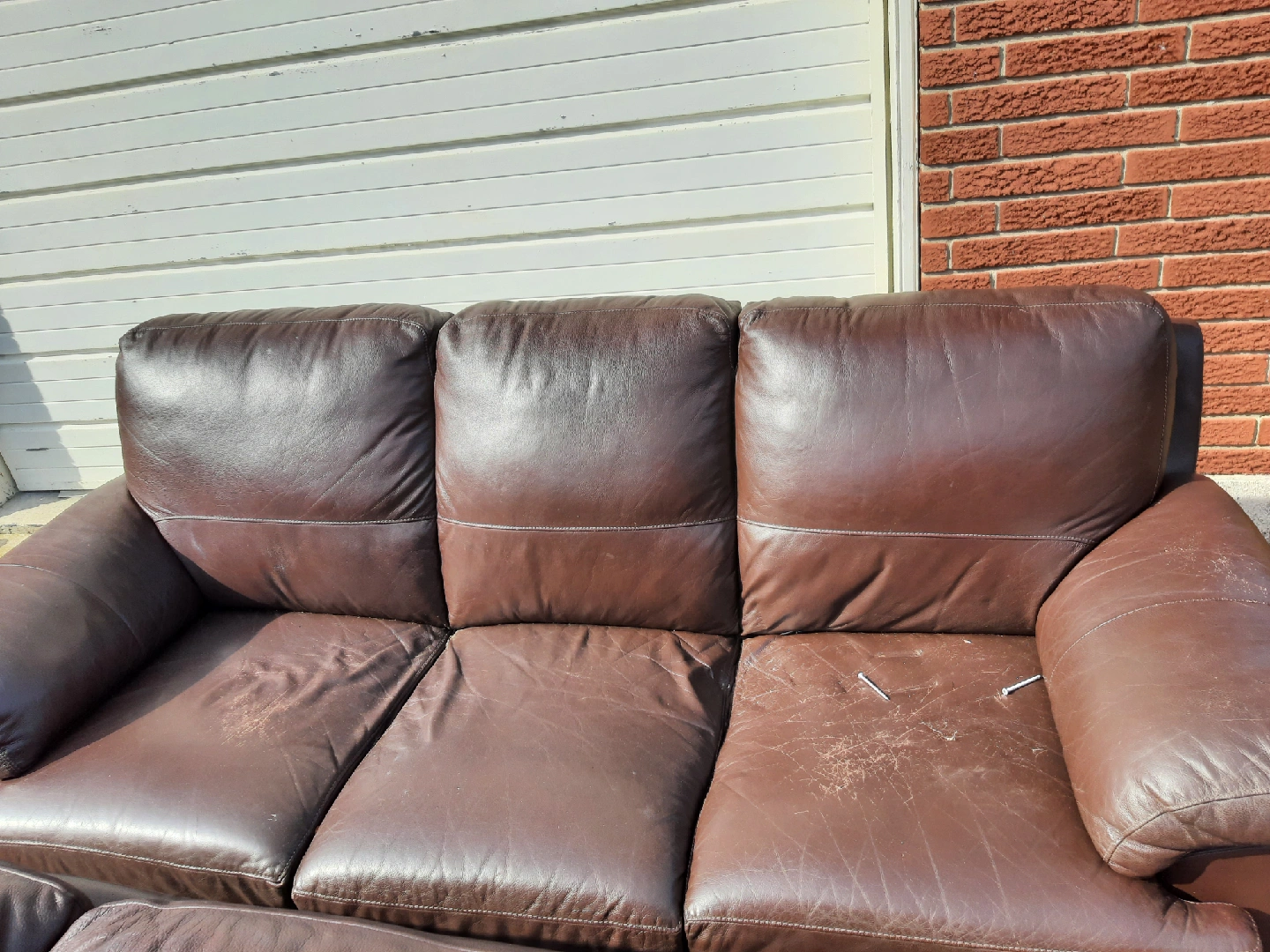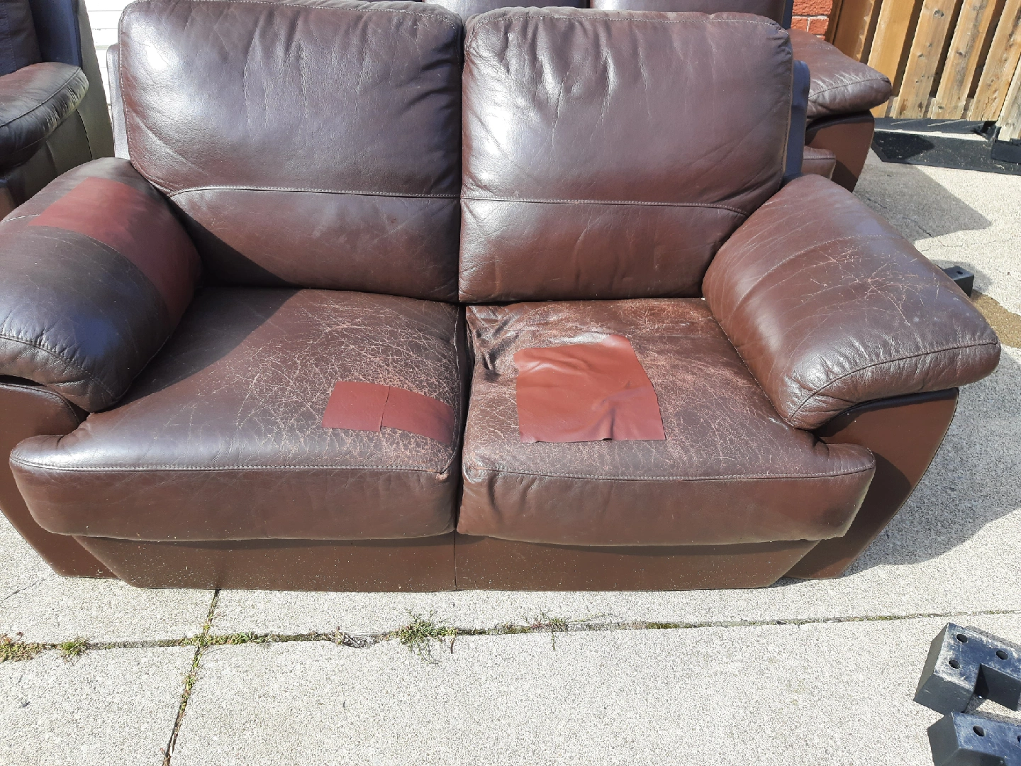 Selling a brown leather sofa set. It includes a 3-seater sofa, a 2-seater sofa, and an armchair. All pieces show signs of wear and have some patching.