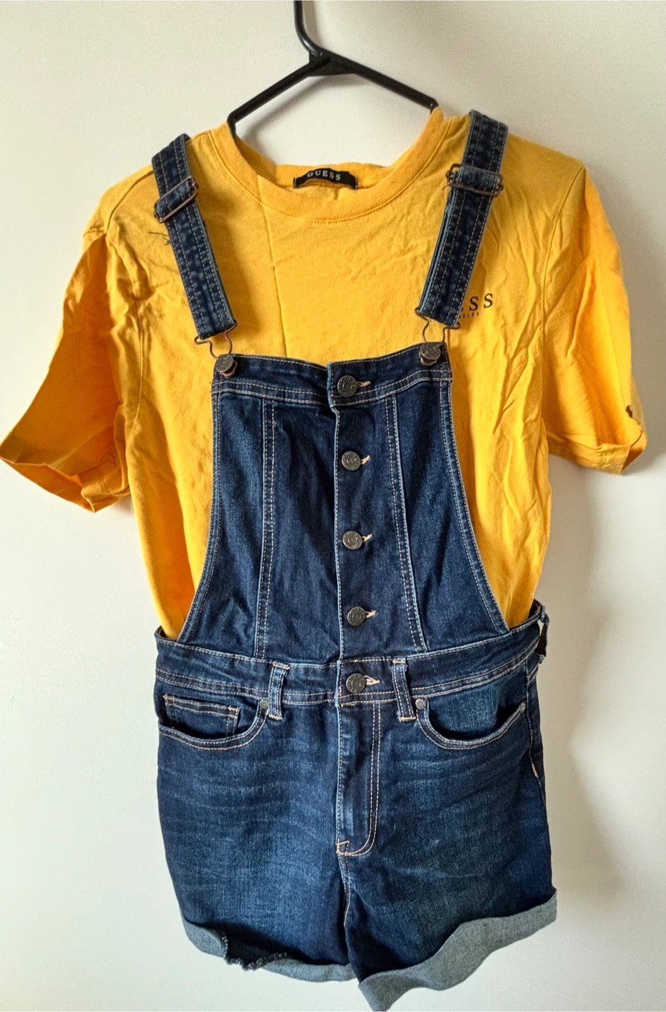 19Cute Guess denim overalls shorts! Great for a casual summer look. The denim is a nice dark wash, and they're in good condition. Perfect for pairing with your favourite tee! Pick up dt Toronto cash only